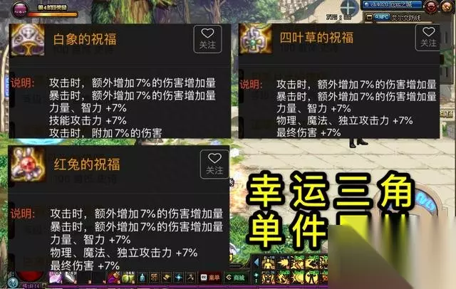(二)首饰:幸运三角套 (1)首先看单件属性,以曾经的“幸运7”装备为理念开发,可以获得21%额外黄字伤害,21%额外暴伤伤害,21%力量智力伤害,14%三攻,14%最终伤害,7%技能攻击力,7%附加伤害。