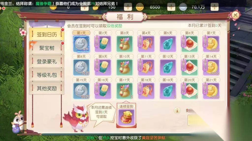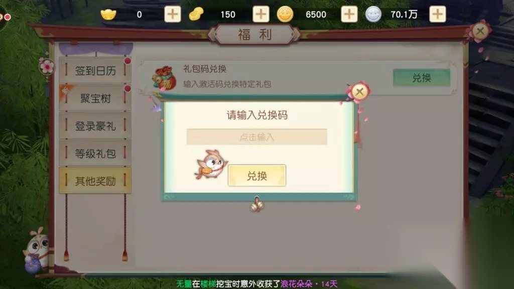 礼包的兑换方式 1.登入游戏,进入游戏界面。 2.在界面左上角点击“福利”按钮。 3.进入“福利”界面之后,会发现左边有五个选项,点击最后一个“其他奖励”。 4.点击进去,有一个“礼包码兑换”选项,点击“兑换”。 5.输入兑换码,获取奖励。