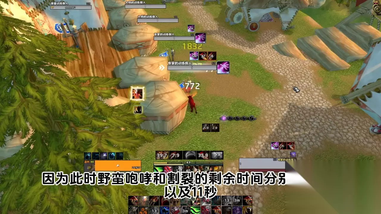 比如现在野蛮咆哮还剩余9.4秒的时候,就提示释放野蛮咆哮,那是不是WA出错了?那必须不是,反而说明了WA的智能。因为此时野蛮咆哮和割裂的剩余时间分别为9.4秒,以及11秒。那么要是等到猫叫结束再补,则补完猫叫就没有连击点来补割裂,那么割裂一定会断一段时间。所以WA提早计算了结果,让我们提前补猫叫来保证猫叫和割裂的覆盖率。 二、AOE提示:当8码范围内目标大于等于3个时会提示AOE,使用我提供的一键AOE宏让你轻松应对A小怪。当使用横扫技能,攻击到几个目标就会弹出数字几的横扫图标并语音播报,你就能非常清楚的知道自己的横扫到底命中了几个目标。