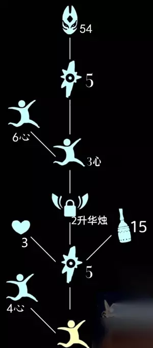 当你收集完毕之后,再次回到这个双人门洞穴,然后就可以激活这个先祖,然后得到蹦跳的动作,然后就能在星盘召唤这个先祖,兑换红狐狸面具了。 二、先祖兑换表 直接兑换:54蜡烛 总消耗:64蜡烛、2升华蜡烛、3爱心