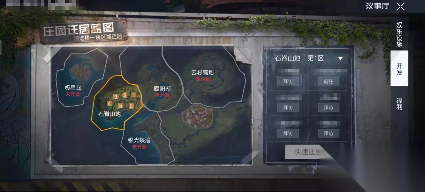 玩家可以自由选择不同地区的同时,也可以在页面当中了解到哪些位置目前是无人居住的,然后随机选择一个合适的地点即可。整个操作流程十分的简单,结束之后大家就可以进入到营地当中来查看庄园目前的情况了。这也是目前进入营地较为简单的一个方法。