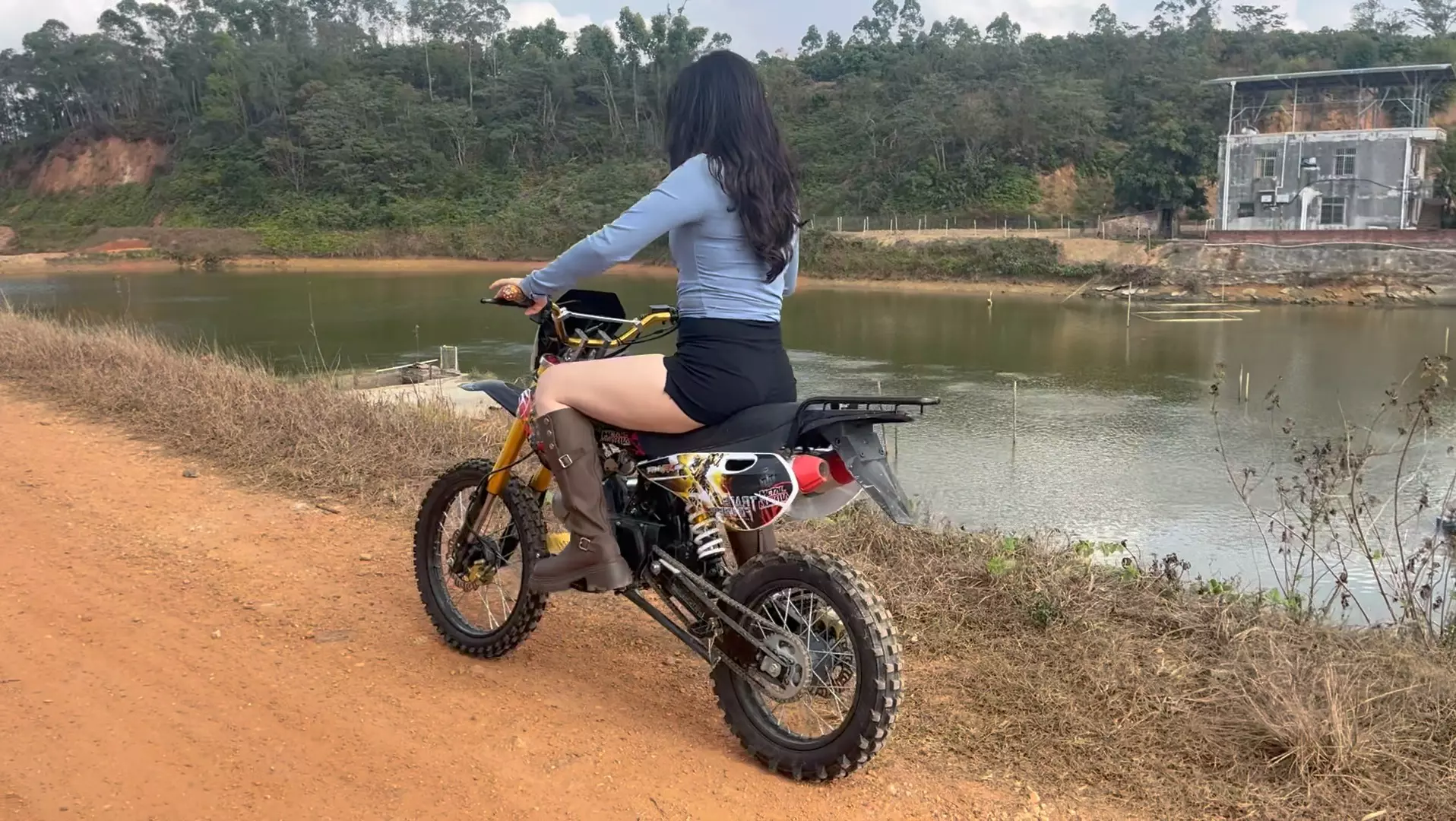 博主在户外乡间土路上骑行摩托车,摩托车出现故障冒出大量烟雾,博主在车旁查看情况,这是一次出现状况的户外摩托车骑行经历。