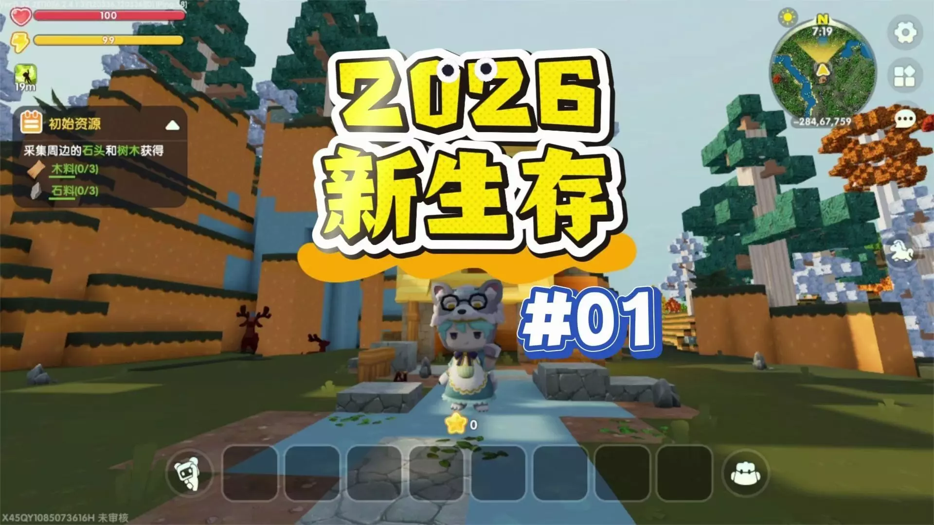 这是《迷你世界》沙盒生存超长版第一期内容,展示了玩家在游戏里采集石头、木材等初始资源,战胜沃沃兽等动物获取材料,还解锁了水泥建筑,推进生存任务的过程。