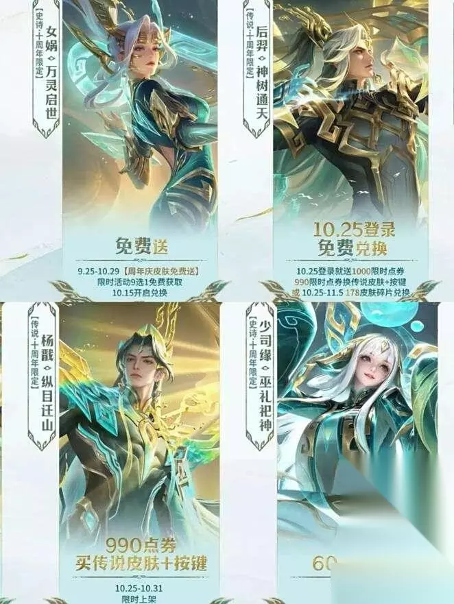 2. 女娲 - 万灵启世(史诗·限定) (1)灵感来源:黄金面具+人首鸟身像,体现“万物有灵”的原始信仰。 (2)设计亮点:“飞鸟之眼”巡视野,技能视觉融入神树根脉与图腾纹样,文化底蕴深厚。 (3)获取方式: - 完全免费:2025年10月15日更新后–10月29日,通过【周年皮肤免费送】活动领取; - 个性按键单独售卖:10月15日–12月24日上架,首周仅需150点券。 重要提醒:错过活动将无法再免费获得,后续返场需花费6折券或直购,建议优先锁定!