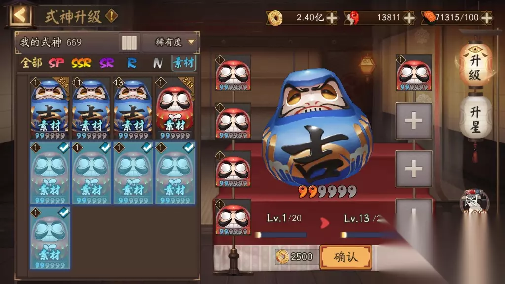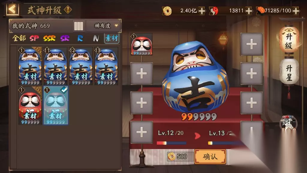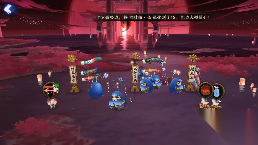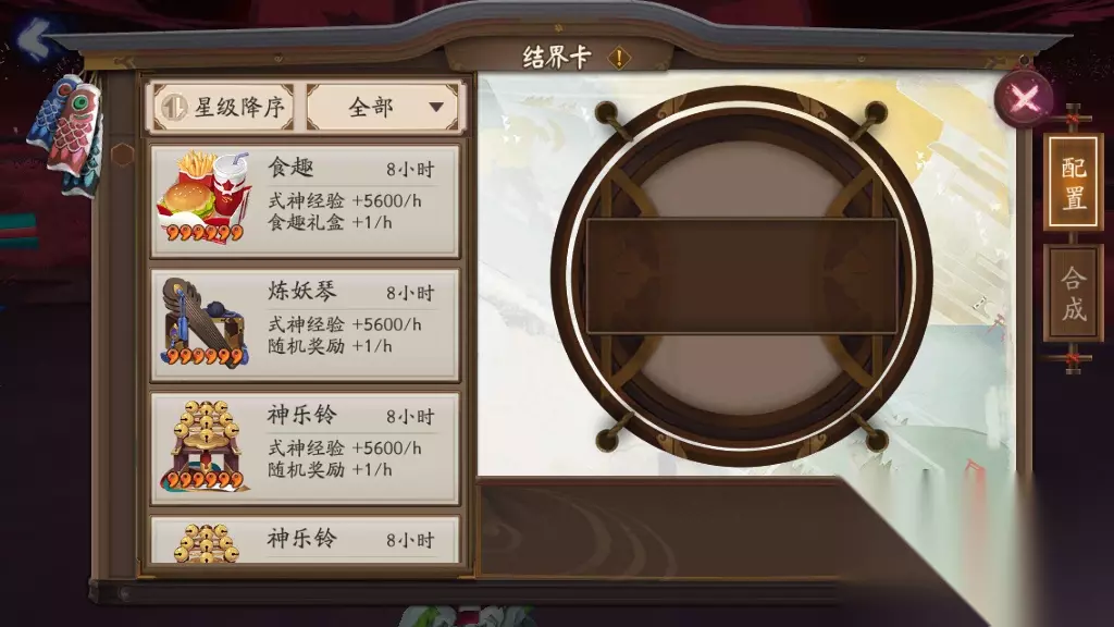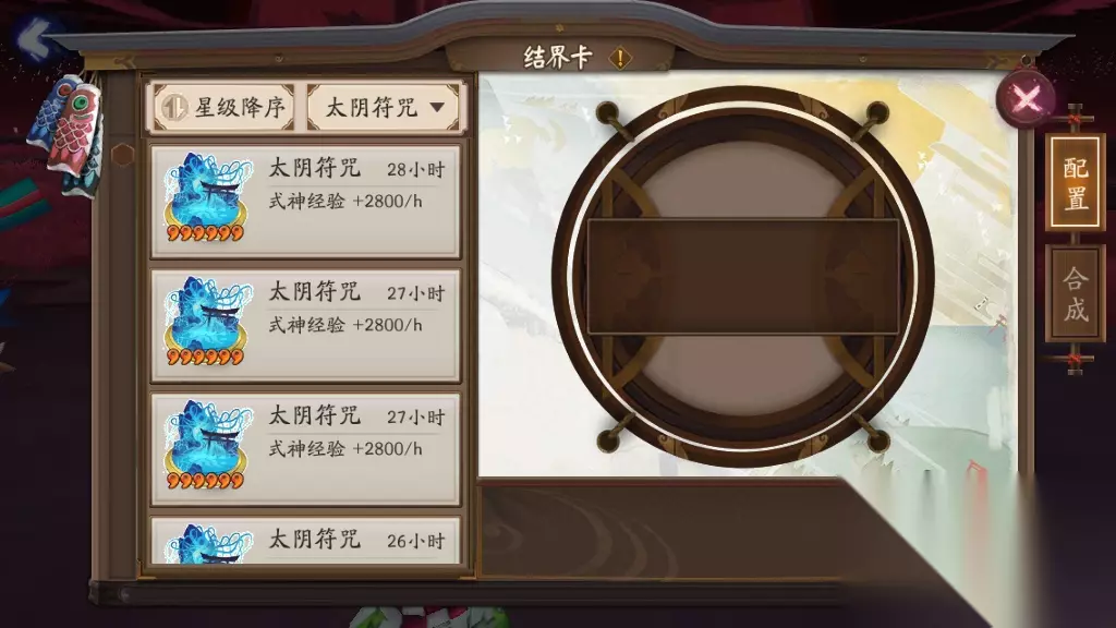 三、托管法 懒到极致的玩家,就连经验副本和石距都不想打,那就选择托管法来解决大吉达摩的升级问题吧。玩家可以选择把6个大吉达摩放到结界里去,通过挂结界卡来给大吉达摩升级。喂养一只13级的大吉达摩需要31560经验,挂6星变异结界卡需要挂5.6个小时,挂6星太阴结界卡需要11.2小时,金币都只需要1000。
