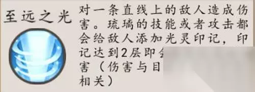 特点:CD30秒,射程极远、伤害较小,可以攻击到屏幕以外的敌人,需要注意的是会有1秒钟的蓄力时间需要预判,蓄力的时候也是可以被打断的。 光灵印记(被动) 特点:是根据敌人的最大生命值计算的伤害,克制一些血量较高的英雄 连招推荐: 1. 【光之加护】+【普攻】+【光芒四散】+【普攻】:这个连招能打出两次被动伤害,配合队友的输出可以在控制的时间内快速击杀对方 2.【光之加护】+【至远之光】+【光芒四散】:夺命三连,定身敌方后可以完美的接上大招,再使用2技能减速对方,后续还可以打出多个普攻。 玩法分析:琉璃是后排辅助型英雄,虽然有被动会提高部分输出能力,但是最重要的还是把1、2技能施放到位,给队友提高良好的输出空间,大招可以在开团前用来压低对方射手的血量。 下面来说说玩法套路: 1. 团队作战 尽量站在武刑或霸刀这种肉盾英雄的旁边,如果队友先手,可以用光之加护接后手,加长了控制时间,还给队友提高护盾。也可以跟好己方的输出位,用光之守护打先手再接减速,如果对方残血逃脱,就用大招收人头。 2. 单兵作战:如果是遇到射手类英雄,可以用小编提到的夺命三连,打的过就打,打不过就跑,需要记住,琉璃是没有位移技能的走位要风骚,不要被对方的英雄先手到 3. 逆风守塔:利用好1技能的强控制和远射程,定身后马上可以接上大招,一般的射手英雄非死即惨。 4. 抢夺神器:琉璃的缺点就是没有位移,一般不要冲到人群中,抢神器这种活就交给前排的英雄吧 符石推荐: 在这小编给大家推荐三套符石 第一套:单排上星套装,追魂4件套+护甲穿透。如果一套夺命三连无法解决问题,就再来一套吧。 第二套:女司机开车套装,痛苦四件套+移速两件套,配合被动可以无视任何肉盾英雄, 1.2技能不断的风筝对手,需要获得王者及以上的驾驶技术。 第三套:邻家少女套装,猫妖+防御两件套,乖巧的躲在霸刀叔叔或武刑叔叔的旁边,放完1、2技能后就向后跑,开一个大招。