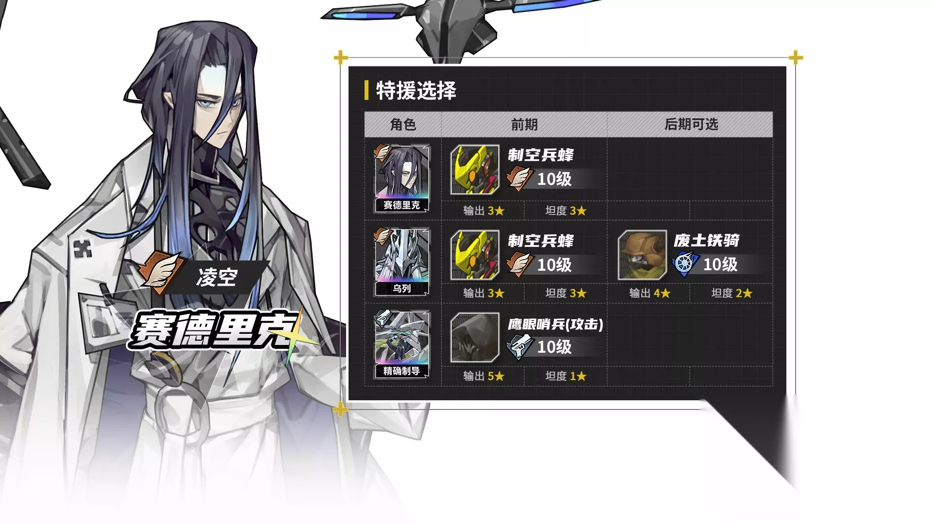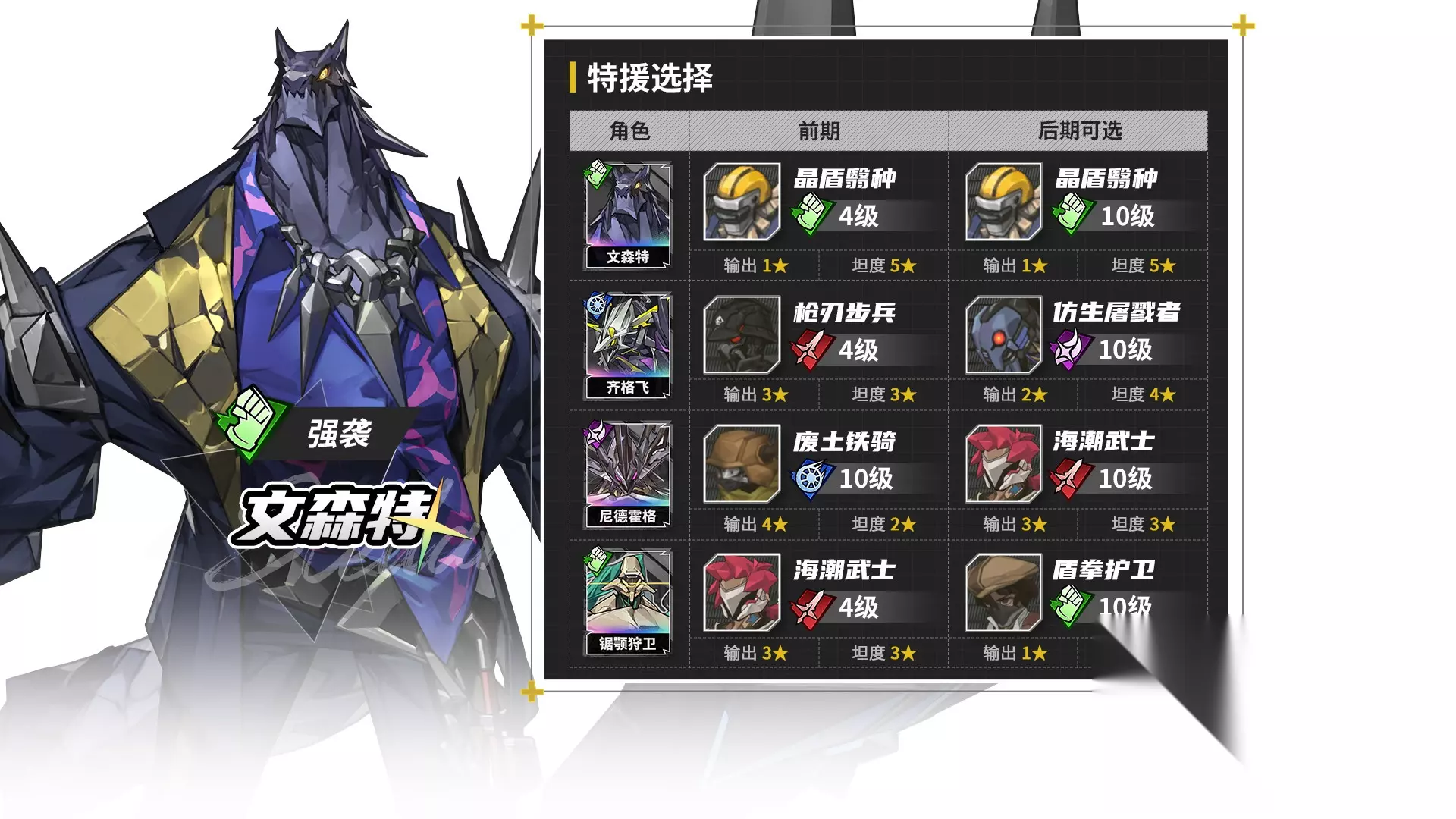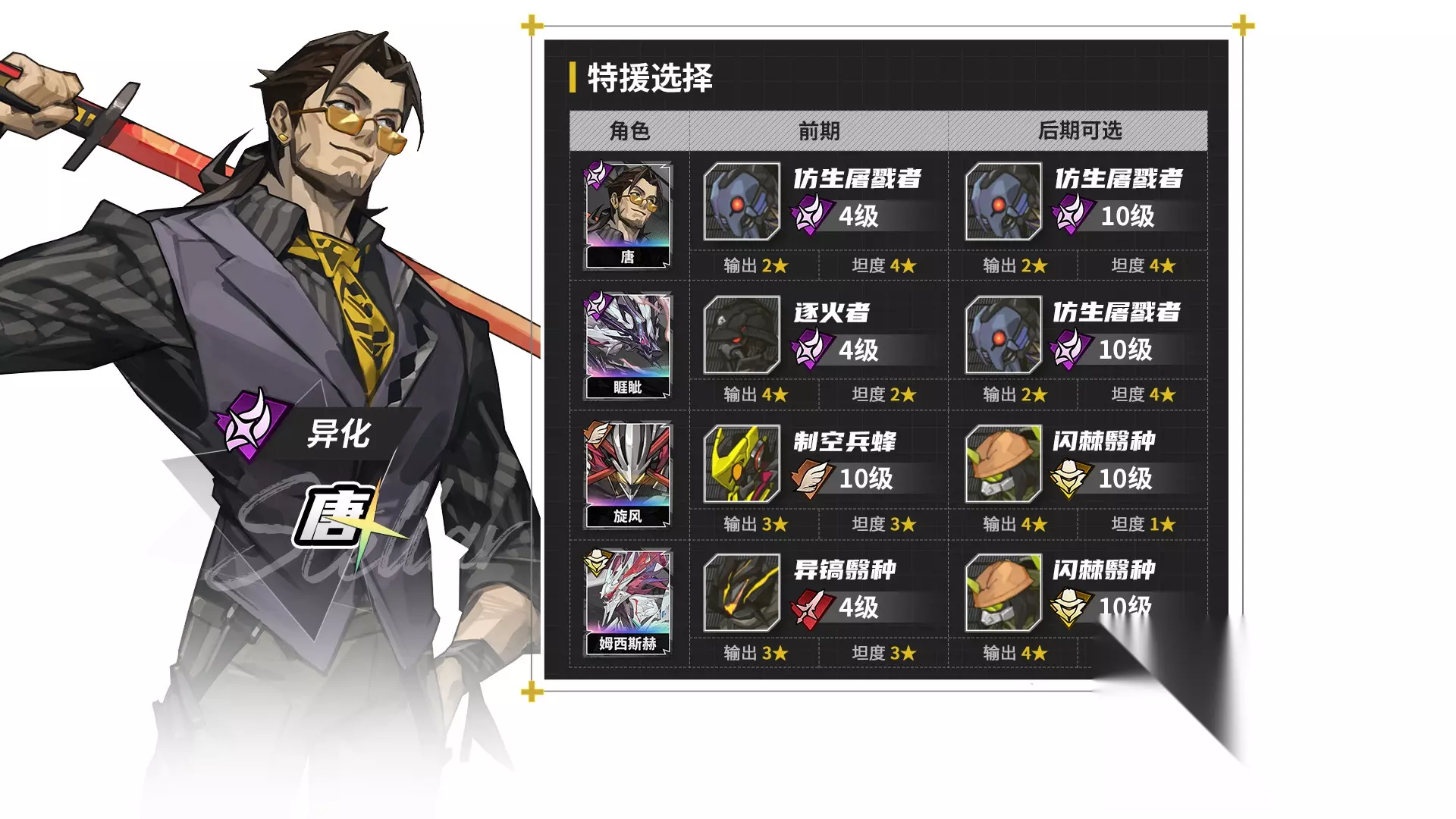 由于特援比较通用,赛德里克从中后期开始好用,乌列形态,既可以带坦度出色的兵蜂,也可以带输出特化的废土铁骑。如果带特工小兵输出还会更高,但养成性价比太不划算。 辉虎