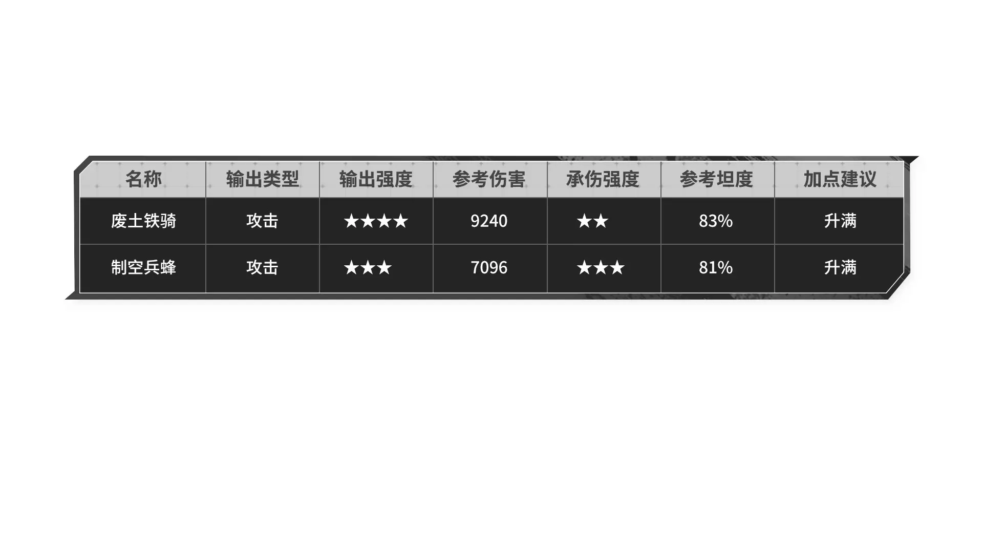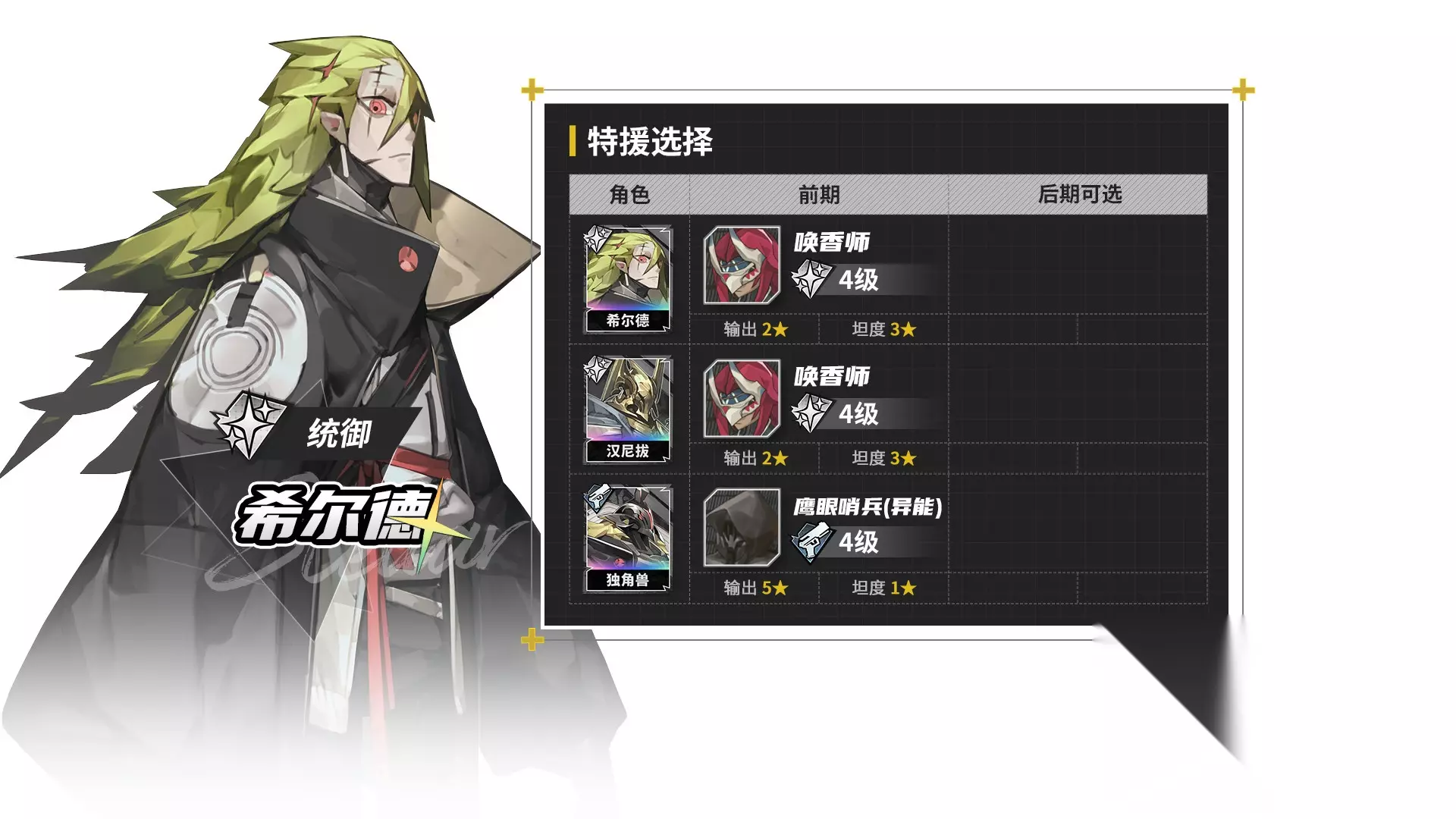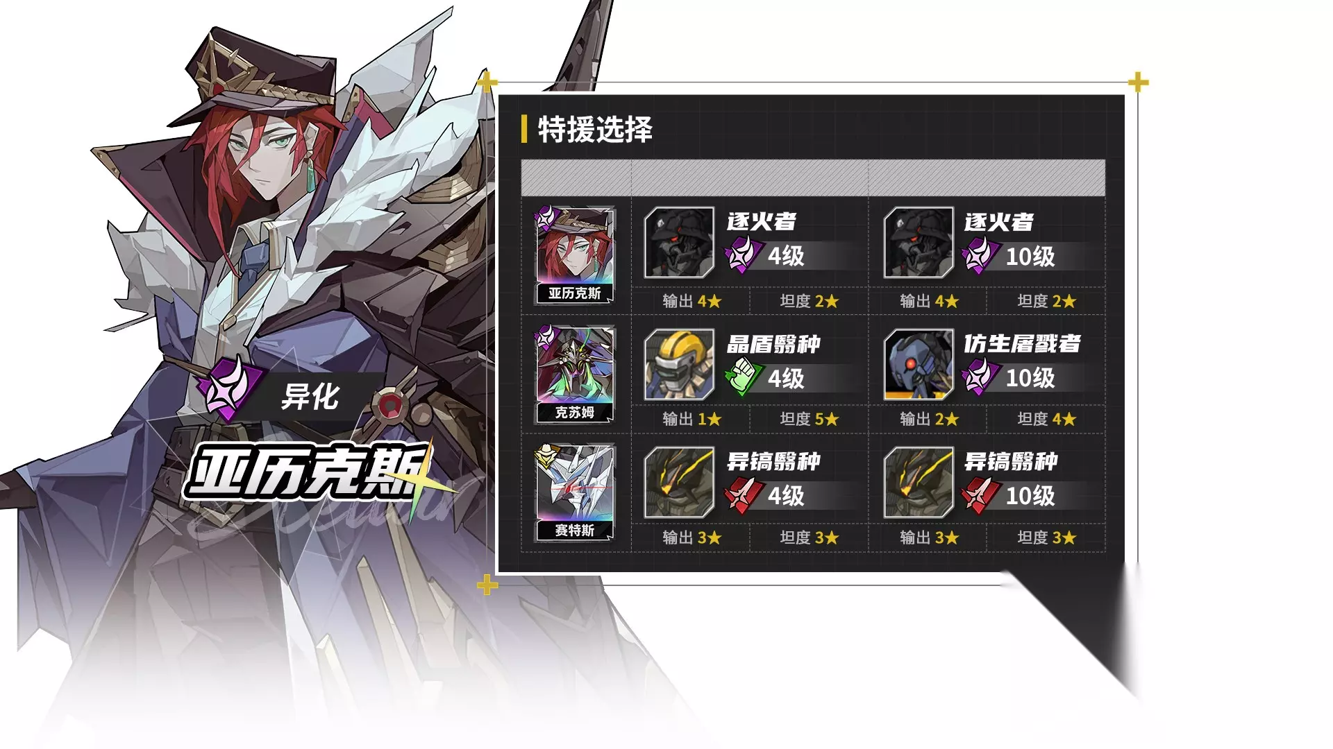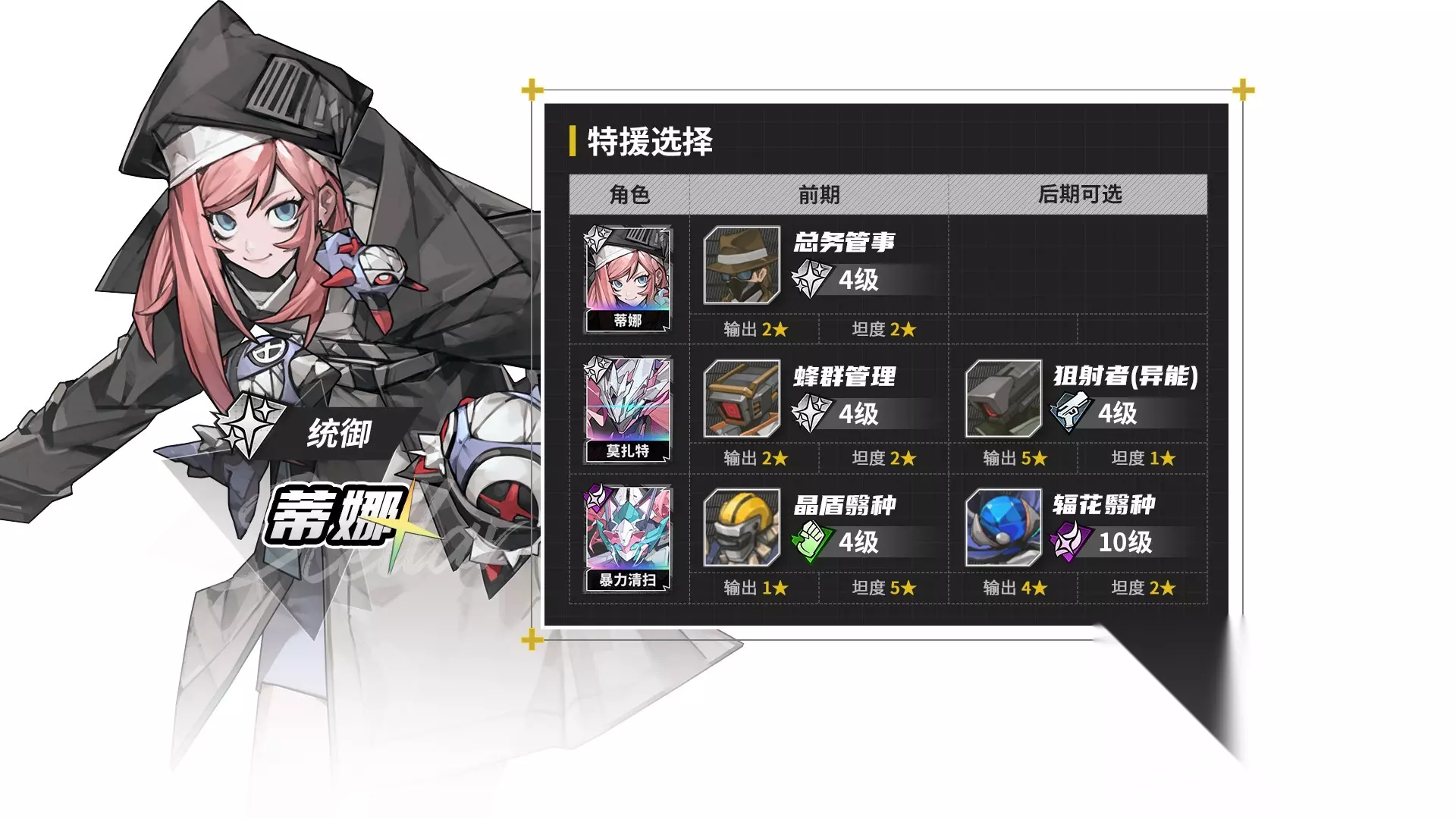 由于特援比较通用,赛德里克从中后期开始好用,乌列形态,既可以带坦度出色的兵蜂,也可以带输出特化的废土铁骑。如果带特工小兵输出还会更高,但养成性价比太不划算。 辉虎