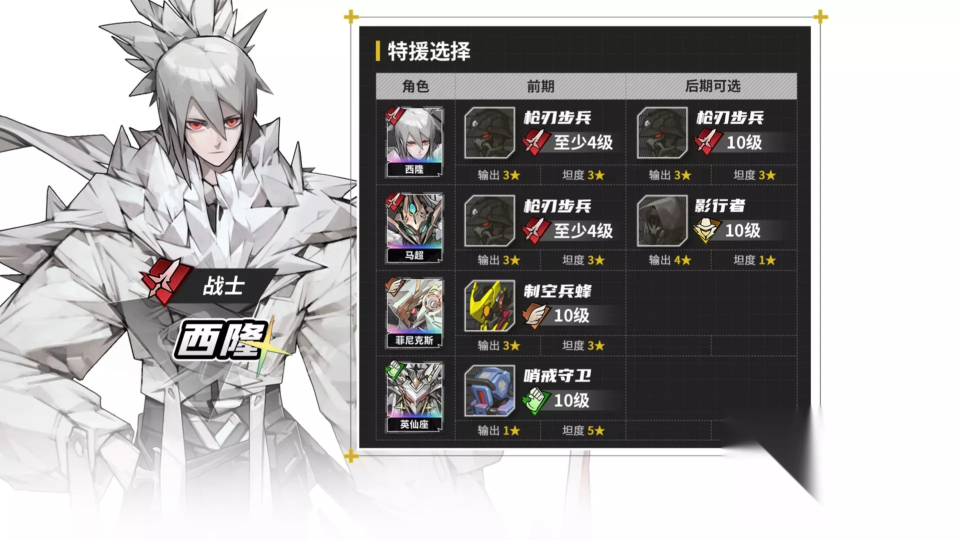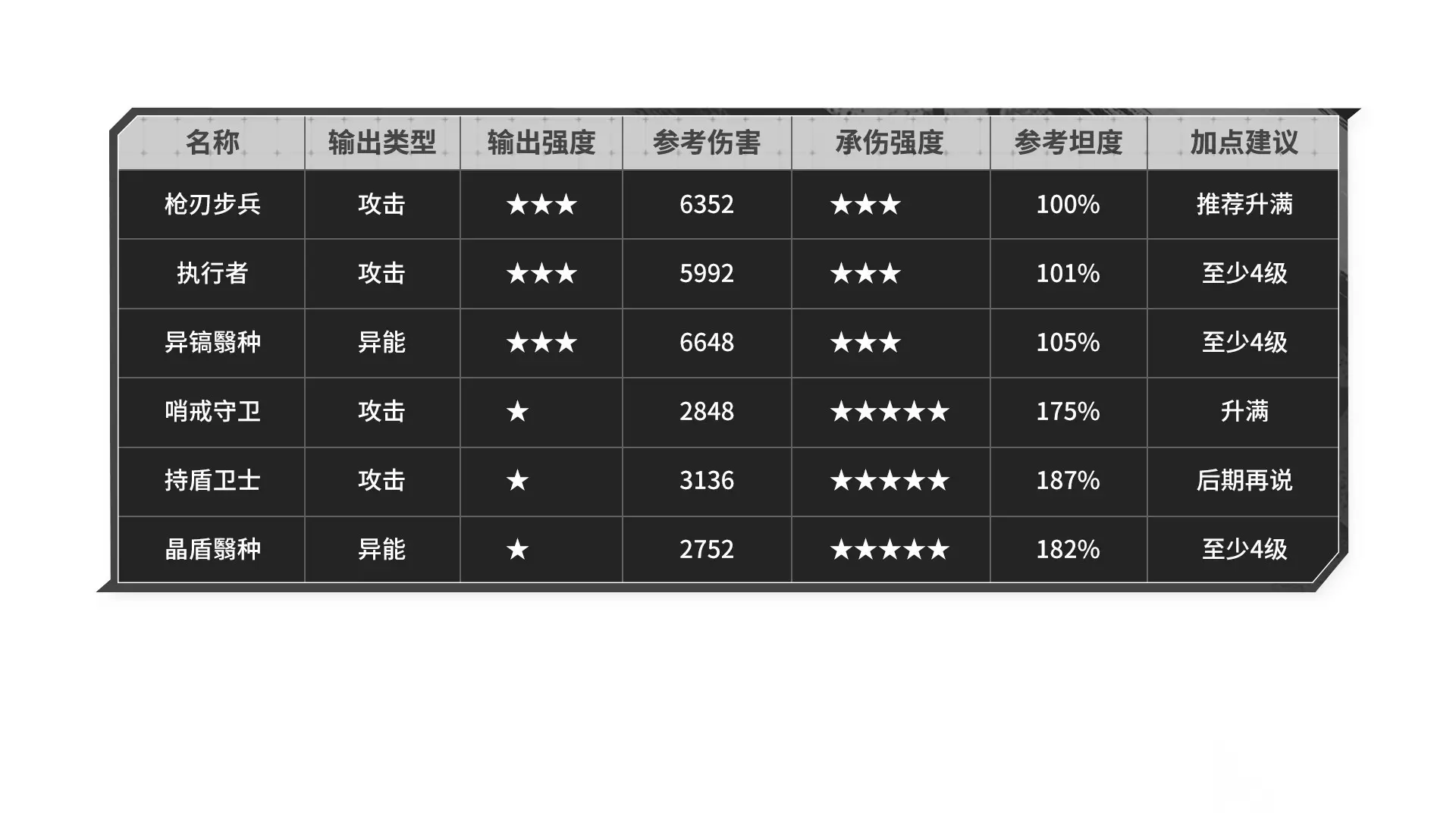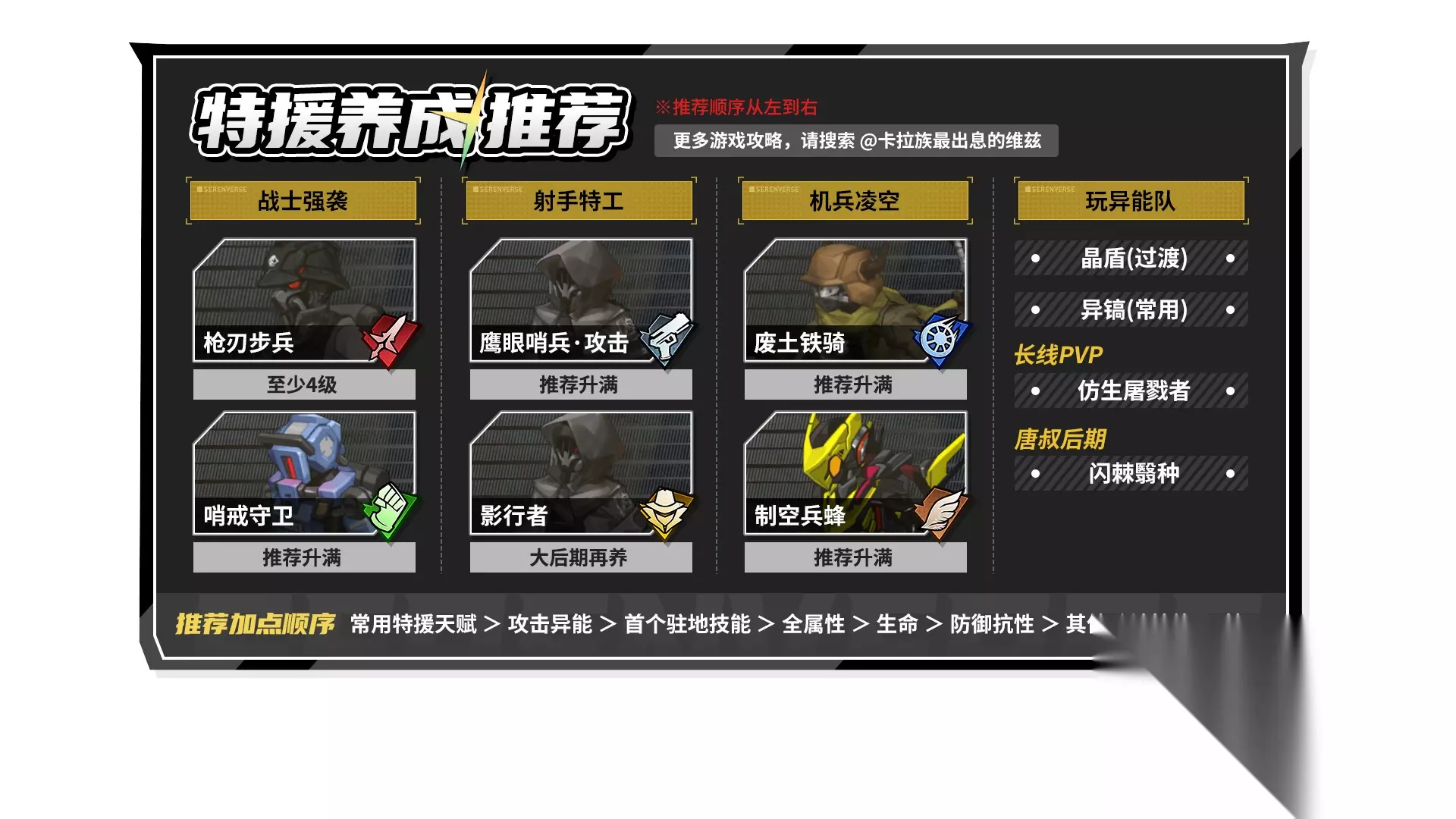 战士职业的【枪刃步兵】以及【执行者】都很泛用,开服版本西隆本体要用【枪刃步兵】,所以升满优先级更高。现在优先升满哪个,更推荐观望下个版本的新角色可以用哪种小兵。 战士职业的【异镐】小兵,适合多位法系近战,主要适配唐叔和6星离姐。在主动出击时,天赋效果能稳定触发。推荐需要时点到4级或者升满。 强袭职业的【哨卫】小兵,主要适配维兹和极星的本体形态,其天赋效果在面对远程攻击时,也能正常触发加防,强烈推荐升满。类似的【持盾卫士】血量,防御和抗性更高,其基础坦度比【哨卫】高20%,但残血加防的天赋效果,无法在战斗中立即触发。考虑其泛用性略差,可以后期再考虑升满。 强袭职业的【晶盾】小兵,最多40%物理减伤效果,安全感拉满。甚至能减少来自地图技的伤害,主要适合文森特,以及非6星的离姐。 射手特工