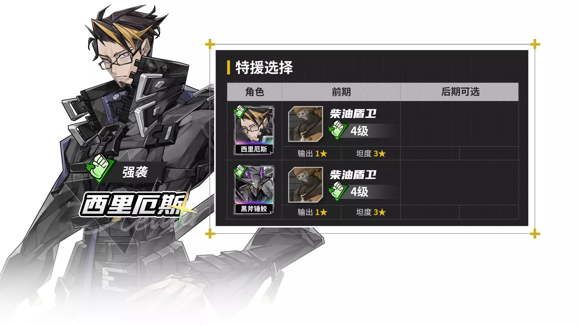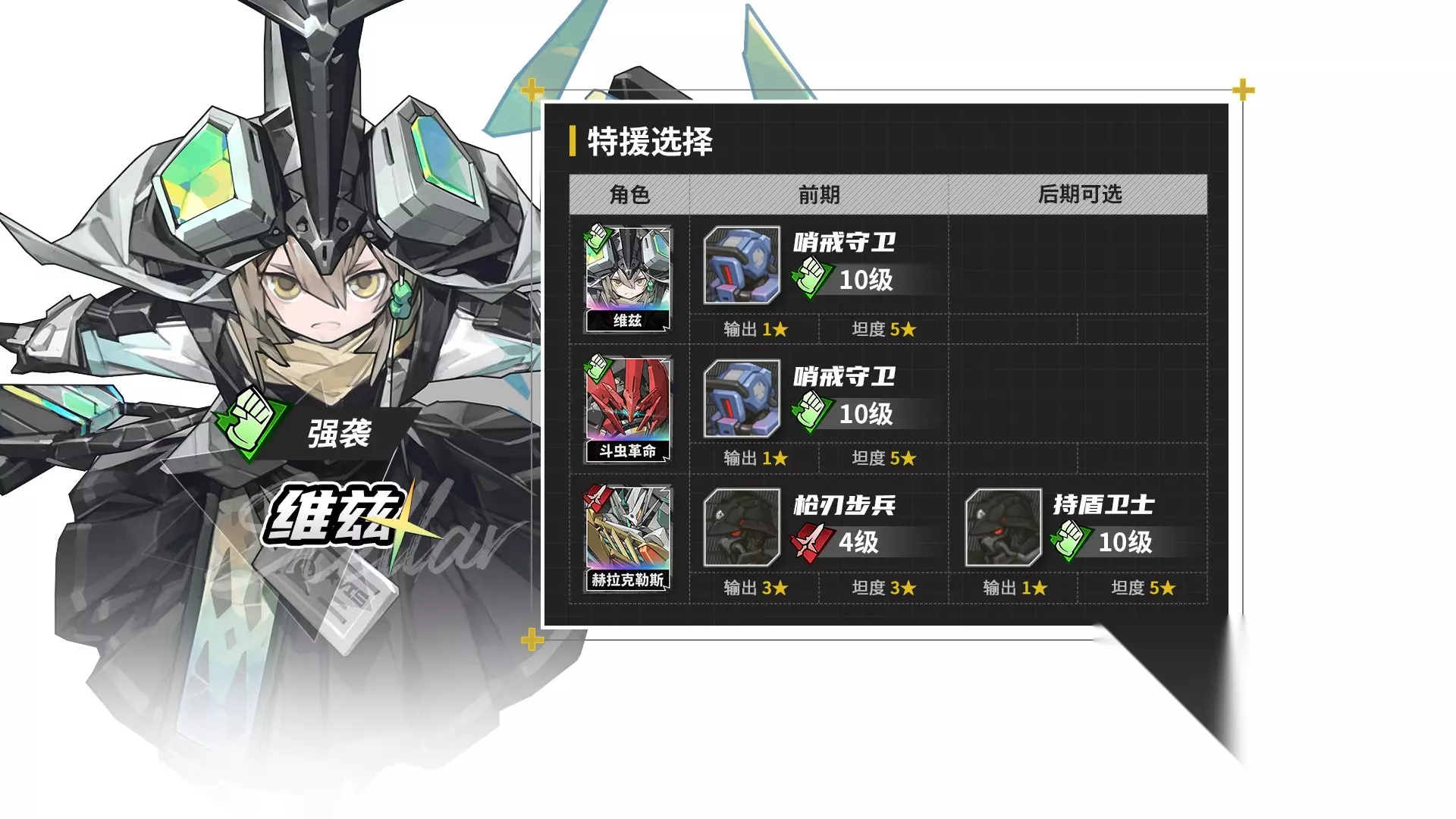 1. 通常情况下,战技比普攻更容易秒人。战技默认能造成10段伤害,每段伤害都会根据当前存活的特援数量,来不断影响伤害分摊的比例。 2. 远程普攻需要打倒敌方特援,才能攻击敌方本体。 3. 如果是近战普攻,只要将敌方特援减至2名以下,后续段数伤害,即可攻击本体。 由于大多数普攻为2~3段,因此只要特援第一段伤害超过敌方特援过半血量,即可不丢失普攻第一段30%~60%伤害。 4.地图技和固伤(包括异常伤害),则会同时对特援和敌方本体造成伤害。 也可以间接理解为,敌方存在特援时,地图技和固伤会造成两次伤害。 常用兵种 接下来我们回到常用兵种推荐 战士强袭 战士强袭驻地的常用小兵有6个,整体都是泛用小兵。