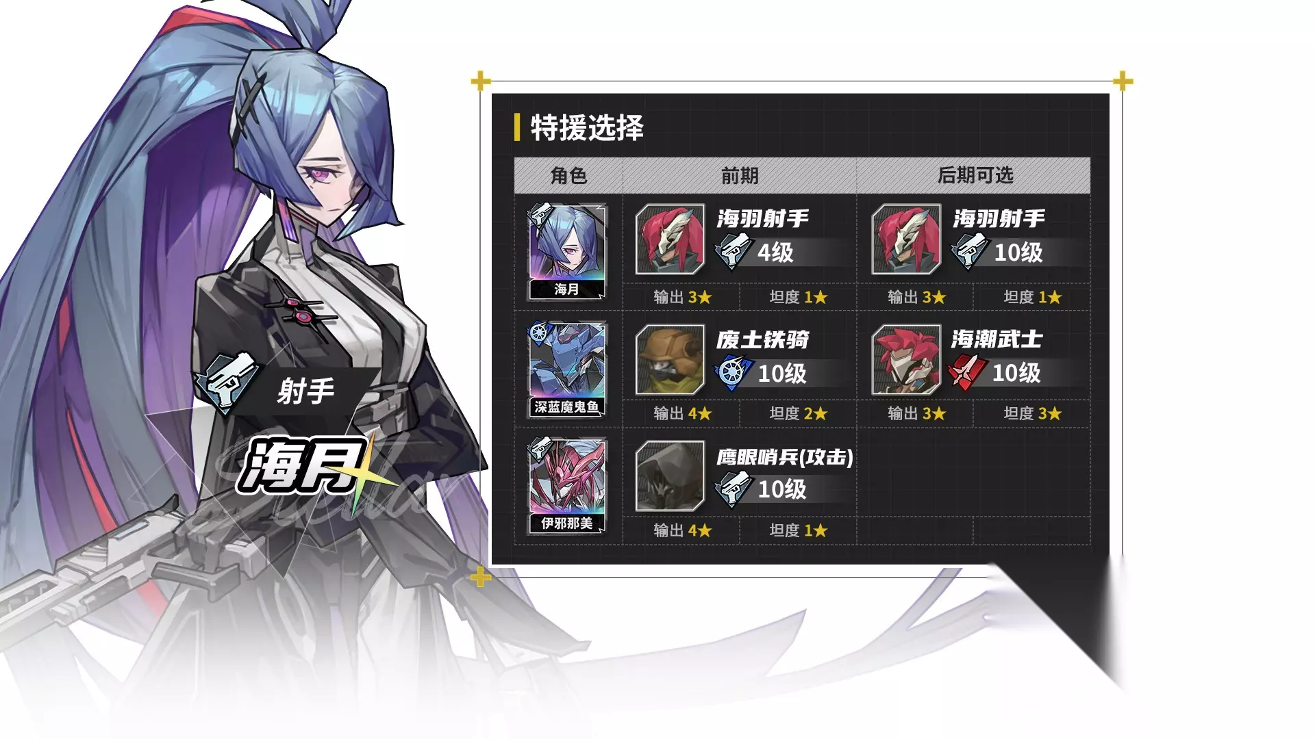 海月天赋再动必暴,会让小兵的攻击也会必定暴击,但鹰眼哨兵的攻击力更高,推荐后期再为本体培养海羽射手。 极星