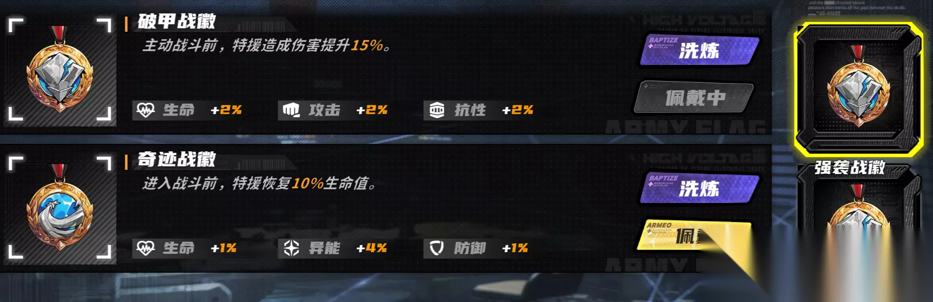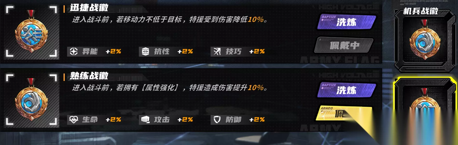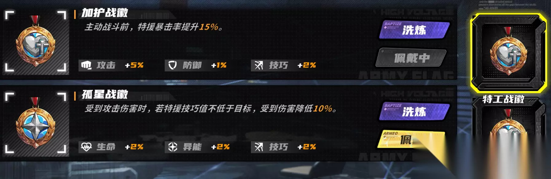 驻地技能就是中间的关键点位,往往能提供不少伤害提升。 攻击与异能的优先顺序,由于射手特工、机兵凌空都是攻击与异能兼具,主要看主力角色携带哪些特援。异化统御驻地则只推荐点异能,因为目前没有主攻击的异化特援。 而技巧排在最后,则是因为技巧收益较低,优先提升特援天赋往往能提供更多暴击率。 战徽洗炼 再来是战徽洗炼优先级。当我们开启战徽后,可以使用4个勋带让战徽附加的3个属性重roll,随机提升对应属性1%~5%。 所有的射手特工,都推荐增加15%暴击率的加护战徽。除了后期暴击率会溢出的鹰眼哨兵(异能),以及闪棘翳种可以使用孤星战徽提升异能属性,剩下异能特援也是使用加护战徽伤害更高。但如果考虑pvp生存能力,也可以使用孤星战徽,10%减伤对地图技也有效。