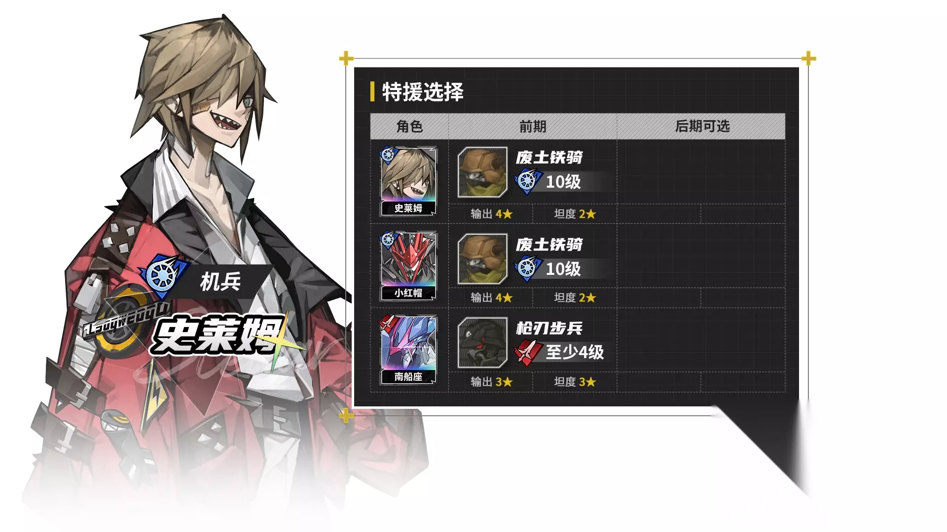 史莱姆的本体和1形态,都直接带废土铁骑。南船座形态如果选密防安保,可以反制敌方机兵,就是性价比太低了。 赛德里克