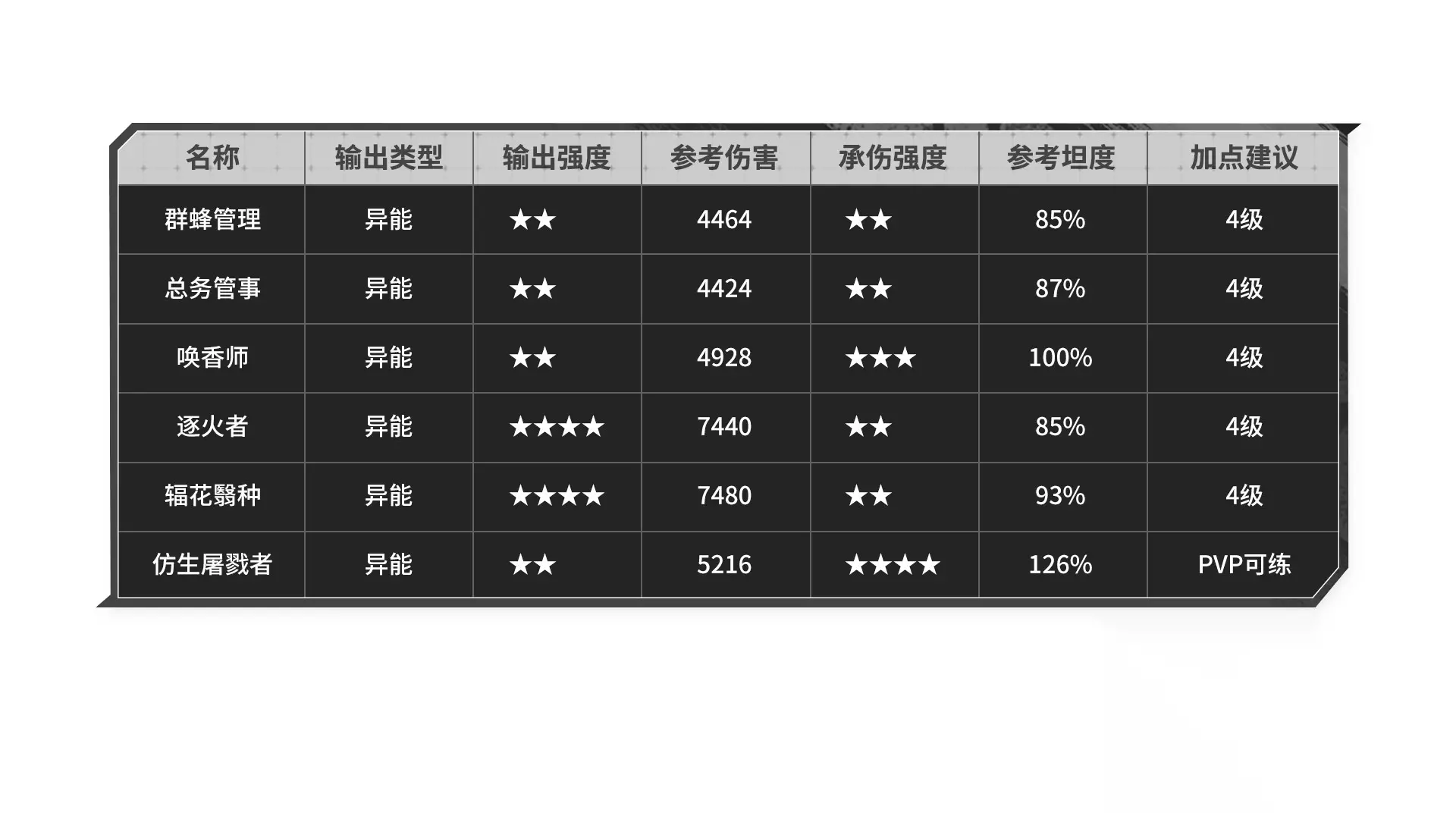 统御可以把后三个小兵升到4级,覆盖了目前版本的全部奶妈。 异化小兵则推荐大后期再练,其中【辐花翳种】可以先削抗后造成伤害,【仿生屠戮者】则是纯PVP小兵,战斗越拖越好用。 驻地加点优先级 当兵种解锁完后,可以回头平铺提升主要点位等级。 因为后续版本可能会开放素材合成,而高等级提升一等素材,可能足够许多低等级提升好几等。 至于等级提升顺序,推荐优先点攻击或异能,以及驻地技能。