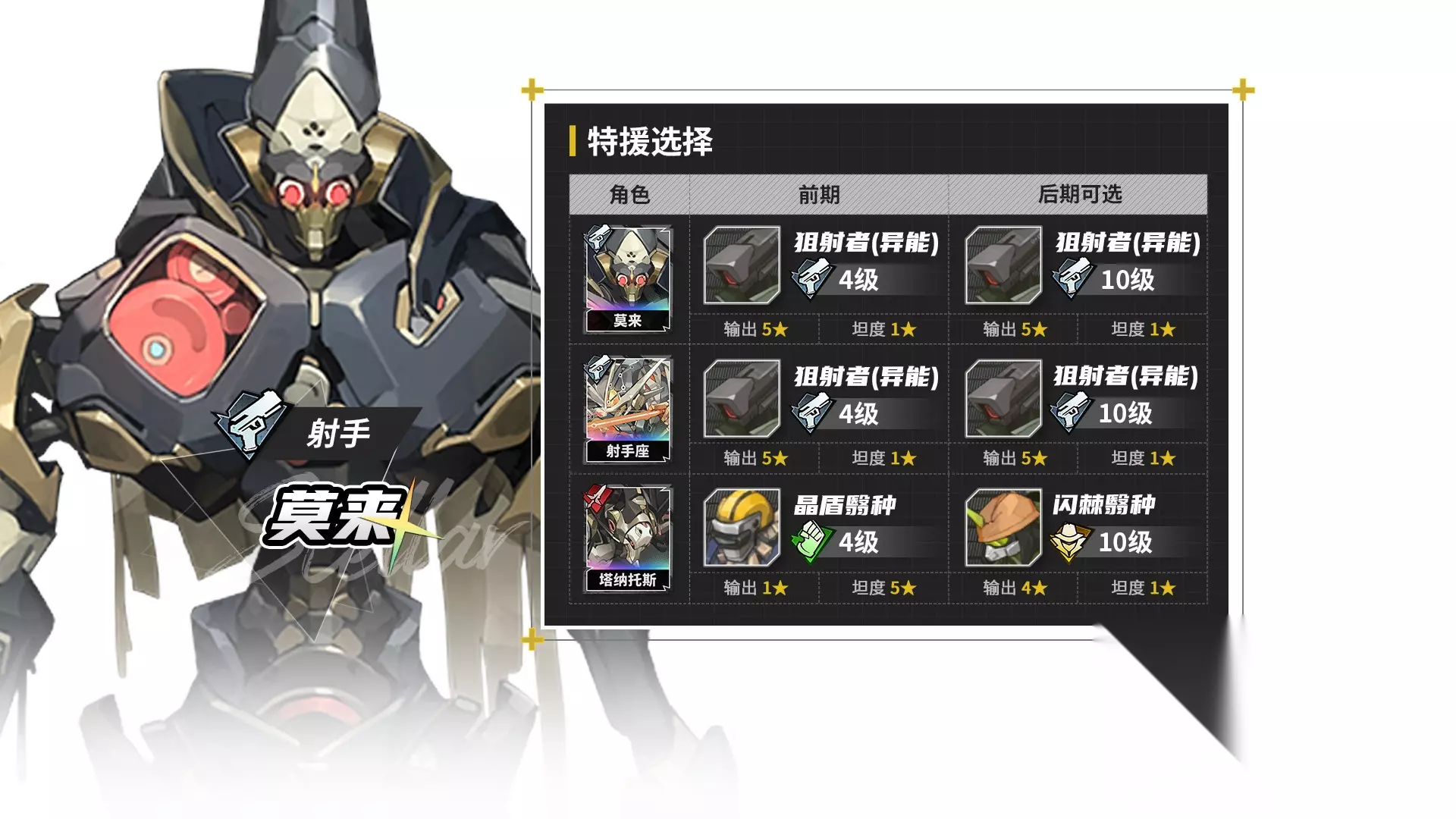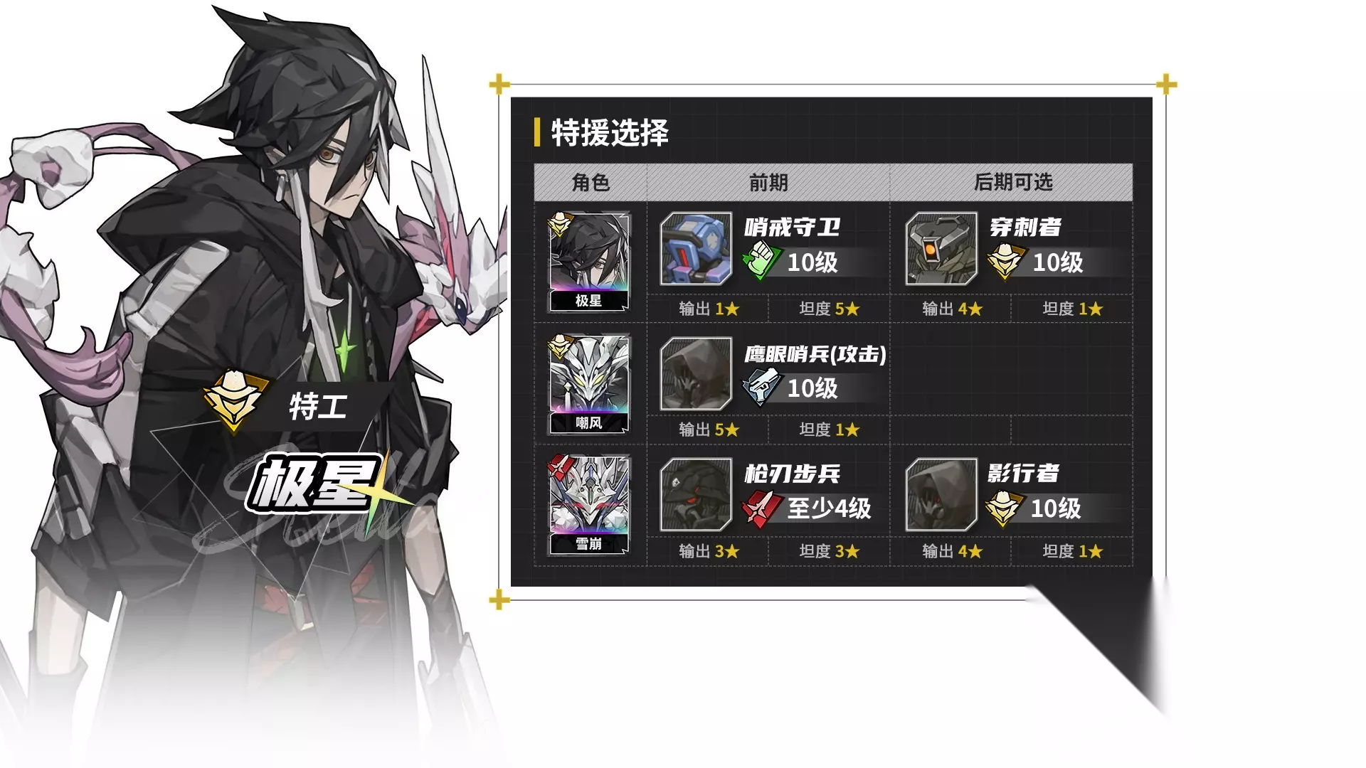其他特援实战技巧 看完了常用小兵推荐,再来说说其他特援的实战技巧。 射程 首先最重要的就是射程,目前只有统御和射手小兵,拥有2格射程,其他全部小兵都只能打近战。特援能吃到本体大多数增益,但用过极星开荒便能知道,即便极星被动使用战技时射程加1,但近战特援的射程不会增加,只会原地罚站丢失伤害。 而当玩家开启精锐特援后,嘲风就可以把近战特援切换成鹰眼哨兵,以害怕近战为代价,可以正常打满远程伤害。 远程特援也能吃到角色的射程增加buff,在莫莱被动的增益生效期间,特援的2格射程也会跟着变为3格。 但反过来看,远程特援本身也只有2格射程,莱诺提升射程时,特援打不到4格远的单位。增益失效后,特援就打不到3格远的单位。 装备 再来是装备部分,特援能吃到套装效果调谐之力,穿红蓝增伤套装时,小兵会正常提升攻击和异能,并获得增伤效果。 穿红黄暴击套装时,小兵会按角色本体技巧的30%,来提升攻击和异能属性。 伤害类型 最后是伤害类型,小兵会打物伤还是法伤,与佩戴小兵的角色无关。只要敌方同时被削抗削防,即使法系角色带物伤小兵,这个组合通常也能打满伤害。 常用角色特援 接下来,按照不同角色,给大家推荐适合的特援选择。 海月
