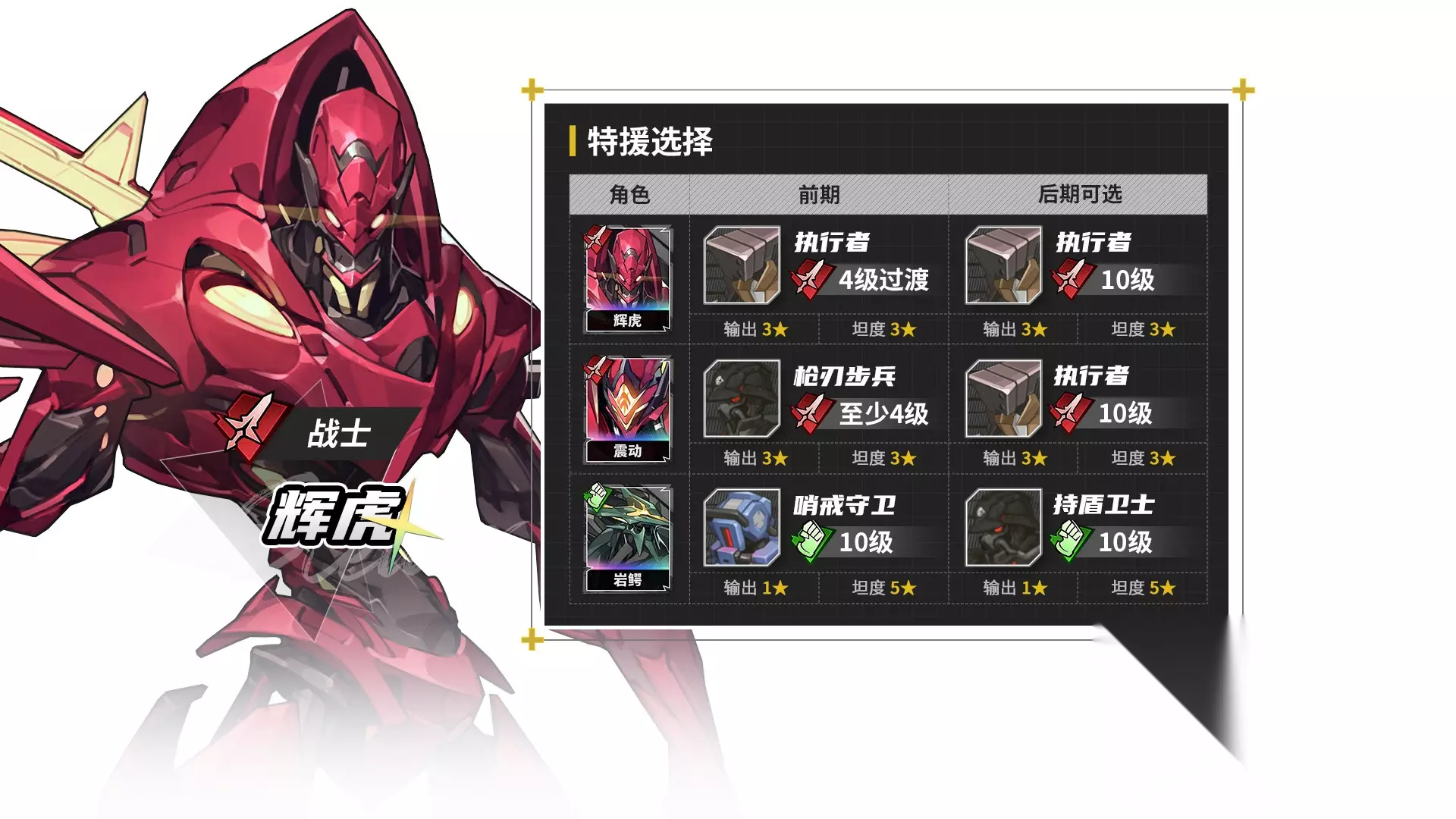 辉虎本体和1形态,都可以带执行者,这两个过渡兵种通常只推荐练一个。 莱诺
