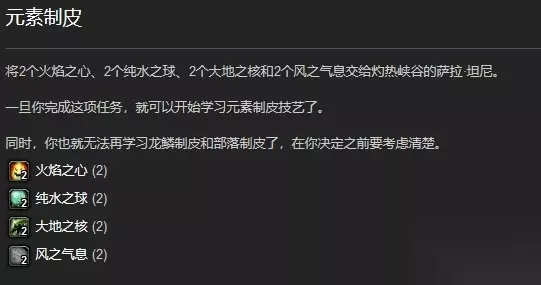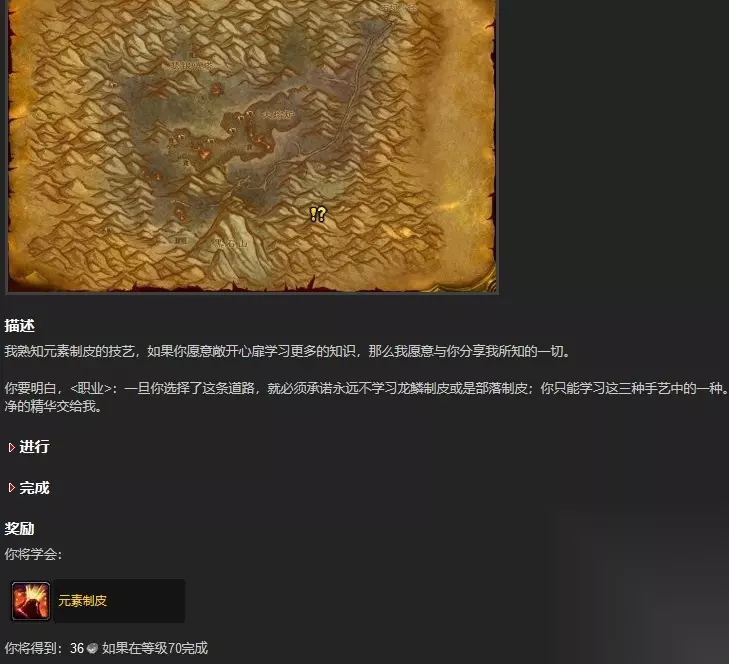 在魔兽世界这款游戏中,元素制皮的学习地点是在灼热峡谷和阿拉希高地。联盟玩家是在灼热峡谷找NPC萨拉·坦尼接元素制皮任务,部落玩家是在阿拉希高地中找NPC布鲁姆·白蹄接受元素制皮任务,完成任务后,就可以学会元素制皮。