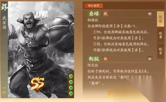 1.一技能-叠嶂 被动转换技能,首先是出牌阶段可以多使用1次杀。 阳的时候:使用的牌被对方抵消后可以立即弃置任意一张牌当做杀对该角色打出。 阴的时候:自己抵消其他角色的牌的时候,可以额外摸1张并视为对其打出了1张杀。这个技能阳的时候注重连续攻击可以打出更高伤害,但是需要自己弃置牌; 2.二技能-断腕 限定技,自己濒死状态的时候可以将体力回复到2点并且修改1技能的阴阳效果; 阳的时候可以弃置1张视为打出2张杀,阴的时候可以额外摸2张。技能效果有一定的回复效果和提升1技能的功能,增加了武将的抗压和进攻能力。 3.武将总结 该武将主要通过1技能来进行进攻和防守反击,而且攻击次数还增加了,特别是2技能有一定的抗压能力,限定技使用后1技能的效果得到进一步加强,进攻和防守反击的能力加强。