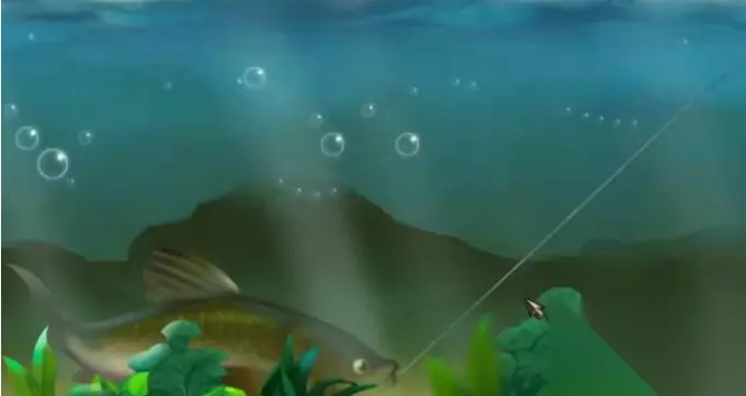 2、其次鱼上钩后,点击鼠标左键,按着不放,就会拉杆,鱼向右边游动,当鱼转方向向左时,松开鼠标左键,如图所示,鱼就会飞快向左边移动。