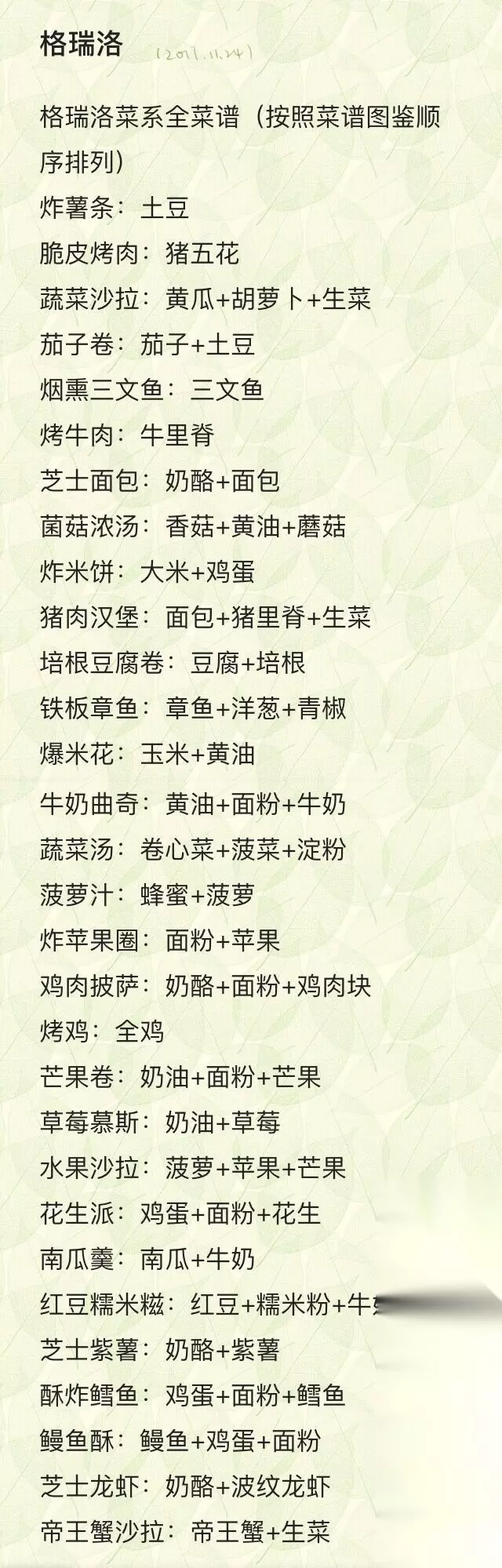 格瑞洛菜系菜谱大全:菜谱配方汇总 1.炸薯条:土豆 2.脆皮烤肉:猪五花 3.蔬菜沙拉:生菜+黄瓜+胡萝卜 4.茄子卷:茄子+土豆 5.烟熏三文鱼:三文鱼 6.烤牛肉:牛里脊 7.芝士面包:奶酪+面包 8.菌菇浓汤:蘑菇+香菇+黄油 9.炸米饼:大米+鸡蛋 10.猪肉汉堡:猪里脊+生菜+面包 11.培根豆腐卷:培根+豆腐 12.铁板章鱼:洋葱+章鱼+青椒 13.爆米花:玉米+黄油 14.牛奶曲奇:牛奶+面粉+黄油 15.蔬菜汤:卷心菜+菠菜+淀粉 16.菠萝汁:蜂蜜+菠萝 17.炸苹果圈:面粉+苹果 18.鸡肉披萨:面粉+鸡肉块+奶酪 19.烤鸡:全鸡 20.芒果卷:奶油+面粉+芒果 21.草莓慕斯:奶油+草莓 22.水果沙拉:菠萝+苹果+芒果 23.花生派:面粉+花生+鸡蛋 24.南瓜羹:南瓜+牛奶 25.红豆糯米糍:红豆+牛奶+糯米粉 26.芝士紫薯:奶酪+紫薯 27.酥炸鳕鱼:鸡蛋+面粉+鳕鱼 28. 帝王蟹沙拉:帝王蟹+生菜 29. 芝士龙虾:奶酪+龙虾 30.鳗鱼酥:鳗鱼+鸡蛋+面粉 2017-10-18· 食之契约怎么玩 食之契约新手必看攻略 2017-12-25· 食之契约进餐时间表 全菜谱进餐时间汇总