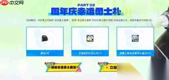 周年核心福利全面掌握 必领福利:登录即送豪华奖励包 在活动期间,所有勇士只需登录指定的17周年庆典页面,即可免费领取一份满载心意的周年感恩礼包!这是DNF对一路同行者的诚意回馈,无需任何条件,上线即可领取! 小额投资,多重回报:6元超值特惠开启 想获得更多福利?在活动页面内仅需充值6元,即可额外解锁一份超值礼包。该礼包通常包含高价值道具(如装备强化券、精炼材料、外观徽章等),是低成本高收益的绝佳选择,适合每一位精明的冒险者。 幸运降临:抽取【幸运勇士徽章】 活动页面设有专属抽奖机制!勇士们每日(或根据活动规则)拥有一次机会抽取【幸运勇士徽章】。一旦成功获得该稀有徽章,即可在基础奖励之外,额外领取一份珍贵的【幸运勇士礼】!这不仅是一份奖励,更是欧皇身份的象征。 努力就有收获:完成任务赢取【周年庆狂欢礼盒】 活动期间,活动页面将发布一系列挑战任务(包括登录游戏、通关指定副本、参与团队战、达成在线时长等)。完成这些任务,即可获得【周年庆狂欢礼盒】作为奖励。 礼盒秘密——累计开启,奖池升级! 单个礼盒可随机获得基础道具。 关键在于:累计开启的礼盒数量越多,你将解锁更高层级的奖励池!这意味着坚持完成任务、开启更多礼盒的勇士,最终将有机会获得顶级道具(如+12装备增幅券、稀有装扮兑换券、梦想白金徽章、大量引导石/雾核等)!持之以恒,方能赢得最大回报。