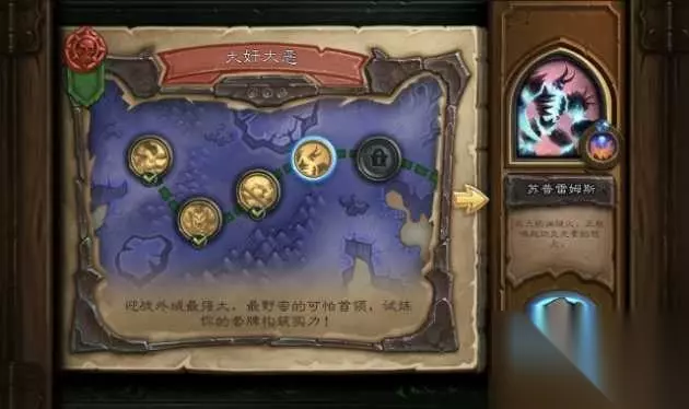 第3关 苏普雷姆斯 技能描述:被动,回合开始时对所有敌人造成1点伤害,每有一个随从死亡,召唤一个6/6地狱火。 主要注意点:怪物身材好一点,可以带打15的红龙女王 推荐卡组:宇宙法 卡组代码: #AAECAf0EHk2KAbsCyQOrBMsE7QSWBewHjQiDlgOfmwOgmwOhoQP8owOSpAO/pAPypQP0qwP1rAP6rAOwrQPwrwPxrwPnsAOBsQOFsQOHsQORsQOItgMAAA==#