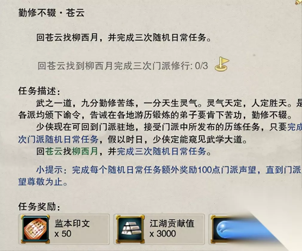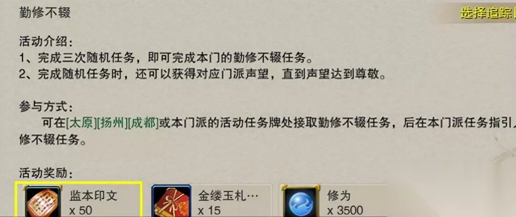 每天都可以做[勤修不辍·自己门派]任务 完成可以获得监本印文、修为、江湖贡献