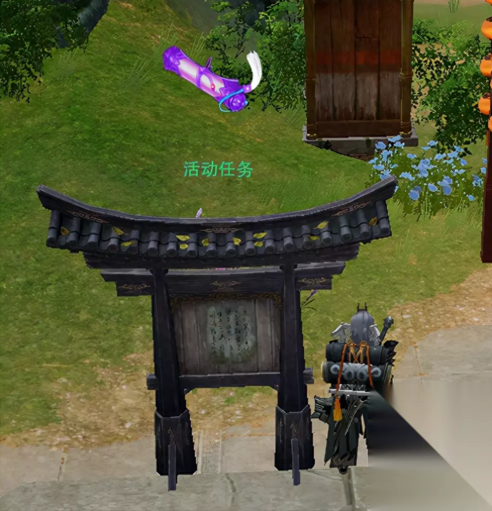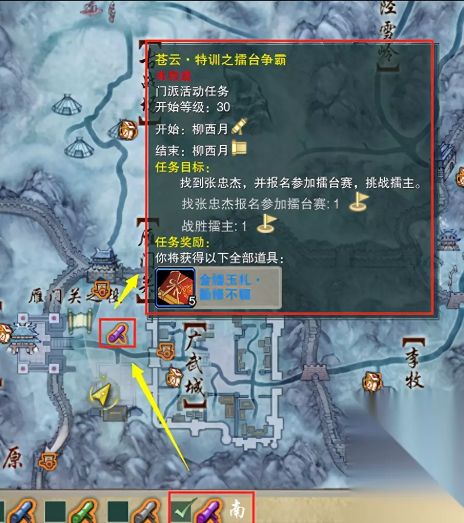 回到自己门派打开地图勾选活动任务标记 可以看到门派日常任务的紫色卷轴