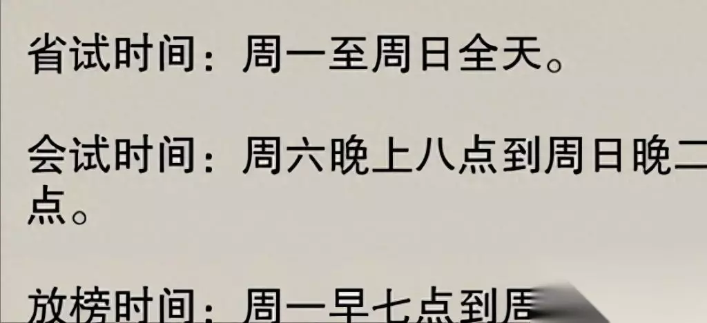 省试时间:周一至周日全天。 会试时间:周六晚上八点到周日晚二十四点。 放榜时间:周一早七点到周一晚二十四点。