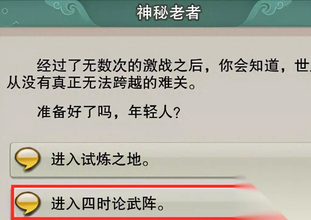 接任务之后根据指引找到神秘老者 对话选择进入四时论武阵