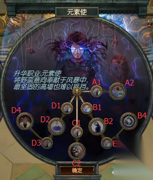 A1【元素伤害和抗性】 加6%元素抗性 增加10%元素伤害 A2【先祖诸王】 当你魔像存在时,增加40%对应元素的伤害 你的元素魔像免疫元素伤害 增加100%元素魔像给你的增益效果 同时最多拥有一个魔像 B1【元素伤害,异常状态几率】 增加10%元素伤害 3%机率使敌人冻结、感电与点燃 B2【悲伤编织】 每14秒: 包含冰缓汇流4秒 包含感电汇流4秒 包含点燃汇流4秒 包含冰缓、感电、点燃汇流2秒 (这些是汇流) (每一种汇流代表所有的伤害会触发该属性的异常状态)【給于100%】 B3【元素伤害,异常状态几率】 增加10%元素伤害 3%机率使敌人冻结、感电与点燃 B4【毁灭光炮塔】 你的技能使元素异常状态扩散12半径 C1【元素伤害和抗性】 加%6的元素抗性 增加10%元素伤害 C2【模范灾难】 减少50%反射元素伤害 在4秒内每个击中你的元素增加你40%该元素伤害 在4秒内每个击中你的元素减少你的8%承受的该元素伤害 (近期内意指4秒内) D1【元素伤害,攻击速度和施法速度】 增加10%元素伤害 增加4%攻击速度与施法速度 D2【毁灭之钟】 每10秒获得增加100%元素伤害4秒 每10秒增加25%范围技能的范围4秒 D3【元素伤害,攻击速度和施法速度】 增加10%元素伤害 增加4%攻击速度与施法速度 D4【混沌天才】 伤害穿透25%冰霜抗性,若你过去10秒内有使用火焰技能 伤害穿透25%闪电抗性,若你过去10秒内有使用冰霜技能 伤害穿透25%火焰抗性,若你过去10秒内有使用闪电技能 【秘书家】