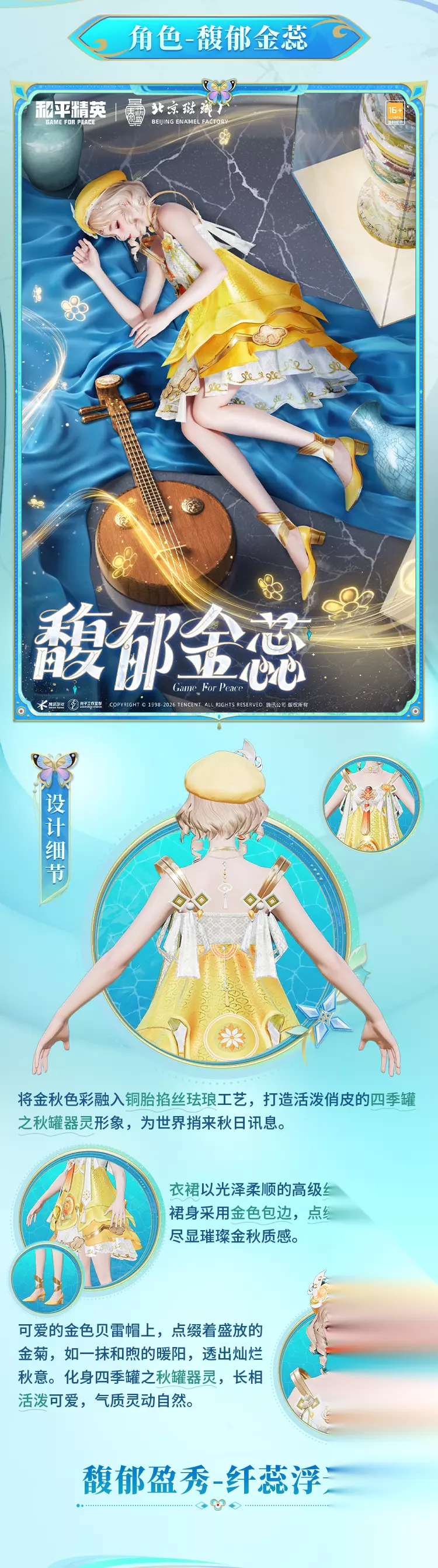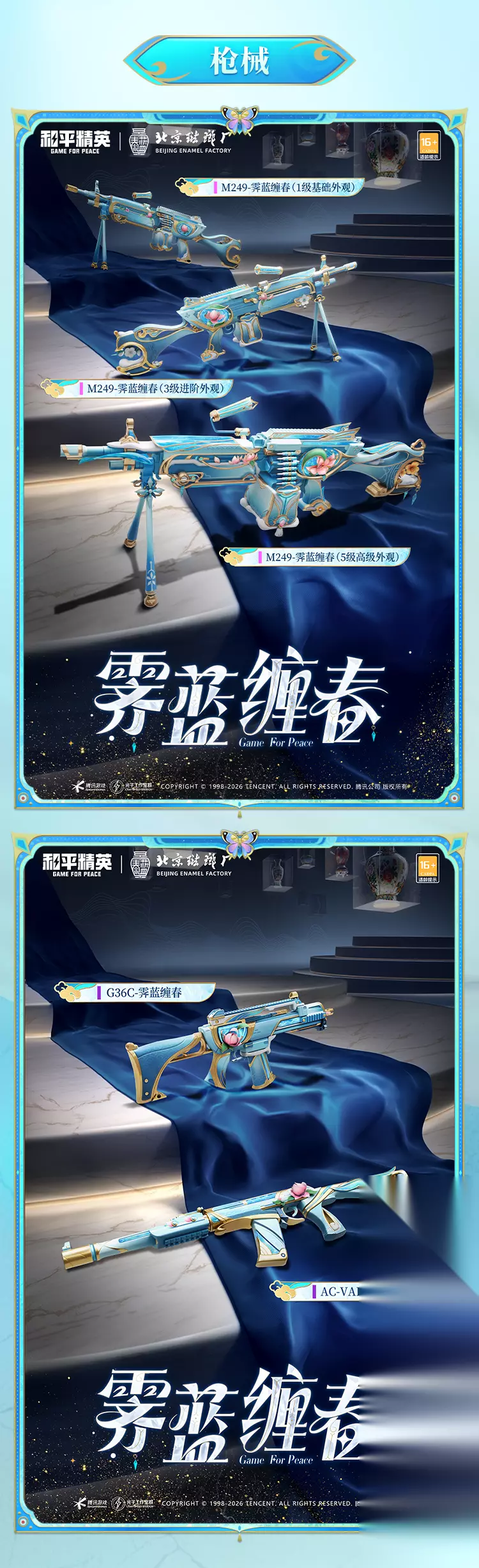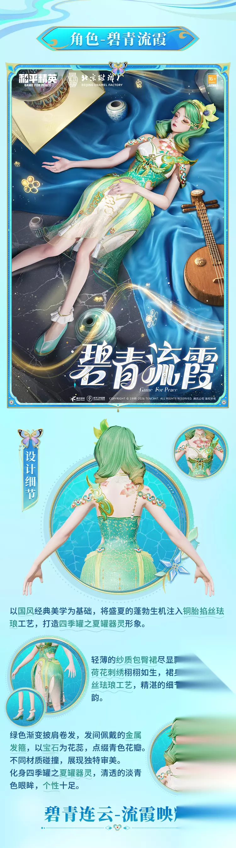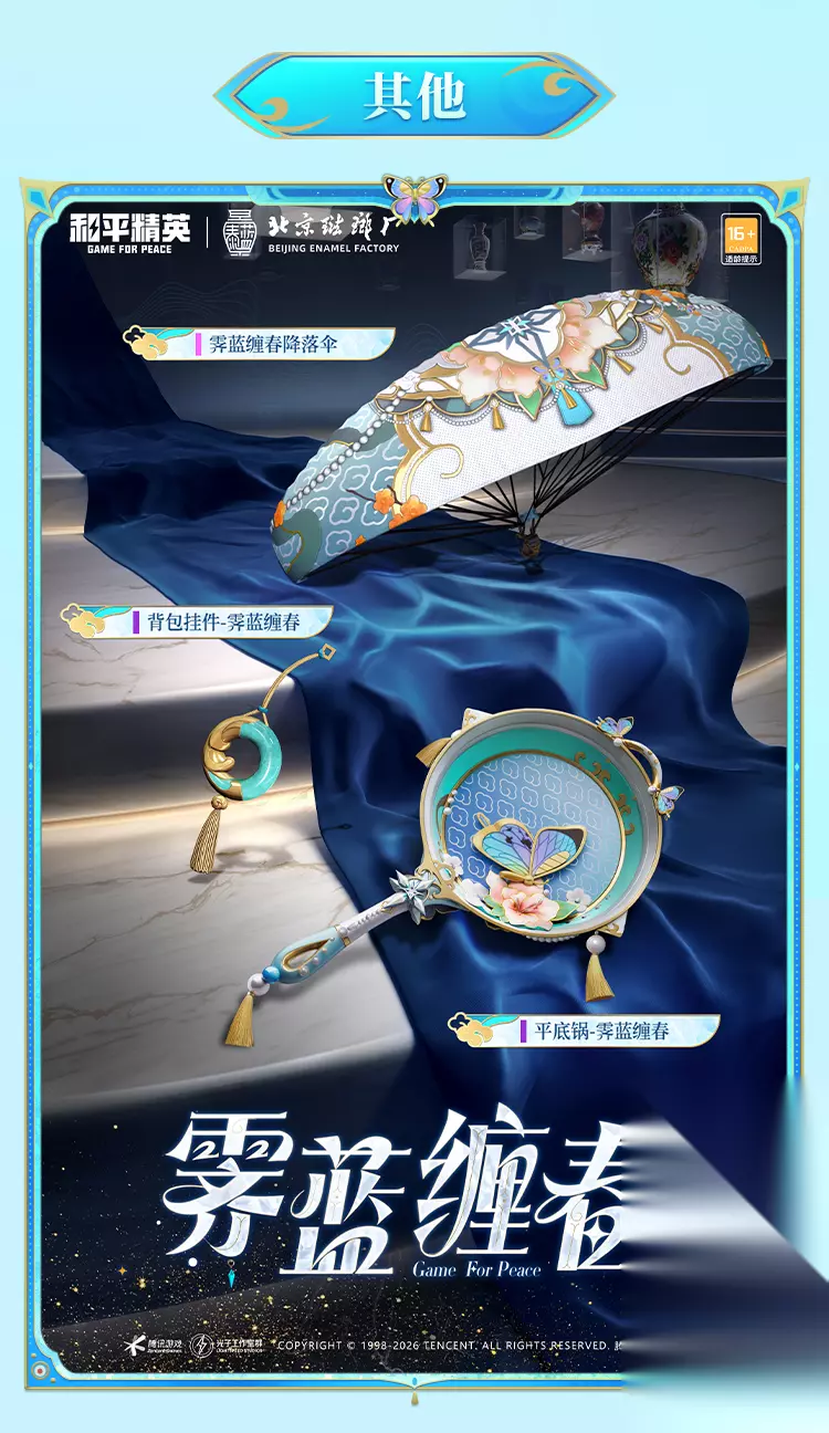当夜幕低垂,苍穹如幕,流转的珐琅釉色唤醒了沉睡千年的器灵。《和平精英》携手北京珐琅厂,以传统铜胎掐丝珐琅工艺为灵感,打造全新国风系列皮肤「琳琅釉梦」,将于 1 月 1 日正式与特种兵们见面!蓝红黄绿等多种珐琅釉彩巧妙交织,将非遗美学与游戏潮流完美融合,带来一场跨越古今的视觉盛宴。 角色皮肤:四季罐器灵,各展风华 霁蓝缠春 —— 冬之雅韵以四季罐中的冬罐为原型,将铜胎掐丝珐琅的精湛工艺融入角色设计,尽显国风经典的文化底蕴。细腻丝滑的绸缎公主裙搭配经典景泰蓝配色,流淌着珐琅釉面独有的温润光泽;白色高跟鞋以金丝纹样勾勒轮廓,镶嵌的璀璨宝石随步履流转微光,尽显高贵仪态。头顶华丽的珍珠钻石头饰,花朵与蝶翼造型栩栩如生,传递出冬日里的美好祈愿。角色脸庞纯洁甜美,气质华贵风雅,完美诠释冬罐器灵的温婉之美。 馥郁金蕊 —— 秋之灵动 萃取金秋时节的绚烂色彩,结合铜胎掐丝珐琅工艺,塑造出活泼俏皮的秋罐器灵形象。衣裙采用光泽柔顺的高级丝绸剪裁,金色包边勾勒出优雅轮廓,裙身点缀的精美刺绣,将秋日的璀璨质感展现得淋漓尽致。可爱的金色贝雷帽上,盛放的金菊宛如一抹和煦暖阳,尽显灿烂秋意。角色长相灵动可爱,气质自然清新,仿佛从秋日画卷中走出,为战场带来一抹明媚生机。 碧青流霞 —— 夏之飘逸 以国风经典美学为根基,将盛夏的蓬勃生机注入铜胎掐丝珐琅工艺,打造出灵动洒脱的夏罐器灵。轻薄的纱质包臀裙尽显飘逸身姿,胸前栩栩如生的荷花刺绣,搭配融入掐丝珐琅工艺的裙身飘带,每一处细节都彰显雅致风韵。绿色渐变披肩卷发蓬松柔软,发间佩戴的金属发箍以宝石为蕊、青色花瓣为饰,不同材质的碰撞呈现出独特审美。角色一双清透的淡青色眼眸,个性十足,尽显夏日的清爽与活力。 枪械 & 装备皮肤:珐琅加持,战力与颜值并存 枪械皮肤 M249 - 霁蓝缠春:提供 1 级基础外观、3 级进阶外观与 5 级高级外观,随着等级提升,珐琅釉色的光泽与细节愈发丰富,枪身流转的霁蓝色调,搭配精致纹样,让火力输出更具仪式感。 G36C - 霁蓝缠春、AC-VAL - 霁蓝缠春:延续系列经典的景泰蓝配色,将掐丝珐琅的工艺质感融入枪械设计,握感与颜值双重在线,助你在战场精准制敌。 装备皮肤 霁蓝缠春背包(1-3 级):从简约小巧到精致大气,各级背包均以霁蓝珐琅色为主调,搭配金丝暗纹,既保证了实用性,又彰显独特国风韵味。 霁蓝缠春头盔(1-3 级):头盔设计融入珐琅工艺元素,釉色均匀饱满,防护性能拉满的同时,让你成为战场中最亮眼的存在。 其他装备:霁蓝缠春降落伞、背包挂件 - 霁蓝缠春、平底锅 - 霁蓝缠春,全方位覆盖战场装备,将珐琅美学贯穿每一处细节,让你在跳伞、搜集、对战的全过程中,都能展现国风魅力。 此次《和平精英》「琳琅釉梦」系列皮肤,以非遗工艺为桥,连接传统与潮流,不仅为玩家带来视觉与手感的双重享受,更让铜胎掐丝珐琅这一千年技艺在游戏中焕发新生。1 月 1 日,邀上队友一同解锁这份国风盛宴,让珐琅雅韵陪伴你驰骋战场,书写属于你的荣耀战绩!