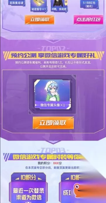 龙族幻想公测微信好礼怎么得? 公测之日即将到来,而作为本作又一值得纪念的盛时刻,自然也会有诸多相关活动。而其中必不可少的是,多种不同的渠道或者平台发布的各类助力公测的礼包。 活动地址:等公测,注册新账号会给。 其中注册礼包,这个其实和很久之前不删档当时的活动类似,送的东西都差不多。需注意,该活动只会面向新玩家。 而后面的公测预约以及赚积分解锁奖励等等,则似乎并没有限定只面向新人,老玩家亦可前往尝试。 即便拿不到专享的称号或者时装,能够免费拿到一个专属头像以及一些其他物资,也算是有赚的。