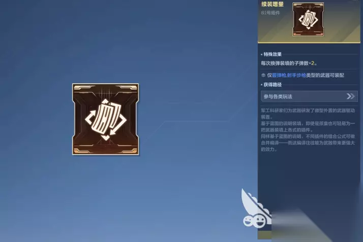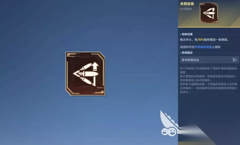 也可以选择续装增量,就是游戏里的01号插件,使用这个插件之后,每一次更换子弹都能让子弹数量增加两个,通过玩家不断装填能让这个枪械的子弹容量变得更多,这样通过多轮的对战,整体的子弹数量会变得更多,玩家在游戏里一次装填,就可以拥有更多的子弹数量,还可以增加杀戮连锁,利用这个插件,每次开火都有机会额外增加一条弹道,这样即便对手在游戏里移动位置,玩家也可以借助这项设定,精准的攻击到对方。