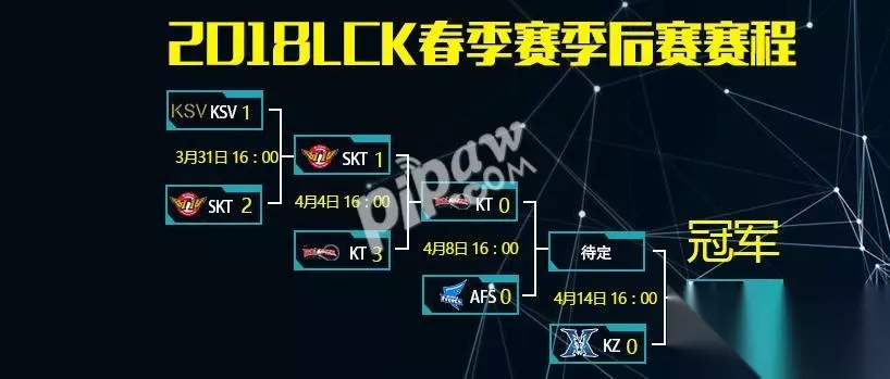 【2018年LCK春季赛季后赛赛程表】 第一场:3月31日下午四点:KSV对战SKT(已结束) 第二场:4月4日下午四点:SKT对战KT(已结束) 第三场:4月8日下午四点:KT对战AFS 第四场:4月14日下午四点:KZ对战待定 以上就是LCK春季赛季后赛全部赛程,KZ战队在春季赛积分榜上居首位直接锁定总决赛,而SKT在季后赛第一轮已经淘汰掉KSV顺利进入第二轮,但在第二轮中不敌KT惨遭淘汰,进入第三轮的KT将与ASF展开晋级争夺,最后谁将于KZ争夺春季赛总冠军,我们拭目以待吧。