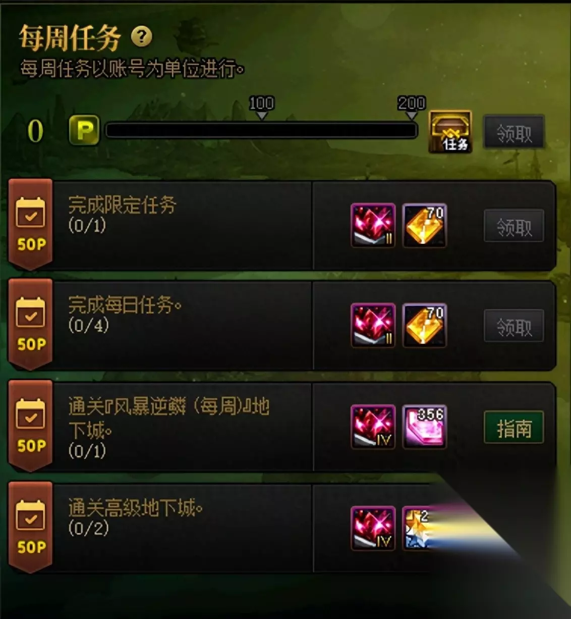 2.畅玩任务 近期便利性改版之后,每周任务部分的完成难度大大降低,且可以从中选择高级地下城史诗装备了。