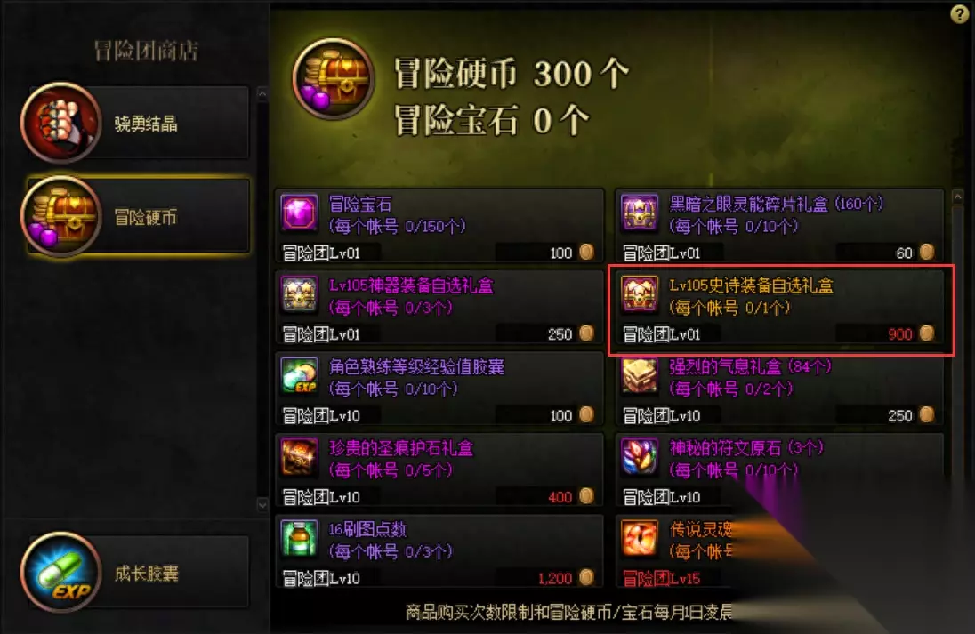 三:游戏内常驻 游戏内也有相当多的常驻途径可以获得史诗自选礼盒,下面笔者为大家整理一下: 1.冒险团商店 冒险团商店当中可以使用900个冒险硬币兑换一个Lv105史诗装备自选礼盒,每月可以兑换一次。