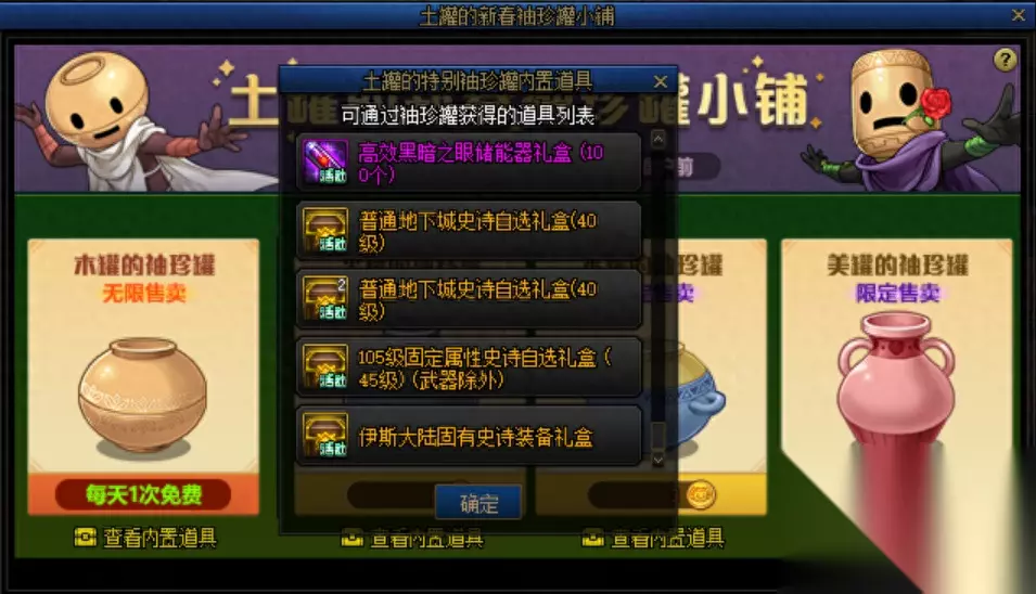 普通史诗装备 使用先兆水晶即可兑换的史诗装备,该品类下装备最多,为流派搭配装备主要来源。使用1527先兆水晶即可在装备之力魔法书处兑换一个105级普通地下城史诗装备自选礼盒。 普通史诗装备的产出副本主要为110级普通地下城,即白色大地、柯涅恩山、纳瑟乌森林等等。 一:活动渠道 1.土罐的新春袖珍罐小铺 消耗五枚新春袖珍罐硬币可以开启活动面板当中的美罐,奖励当中包含3个普通地下城史诗自选礼盒、1个105级固定属性史诗自选礼盒与1个伊斯大陆固有史诗装备礼盒,为不放回抽奖形式,累积开启次必定获得全部奖励。
