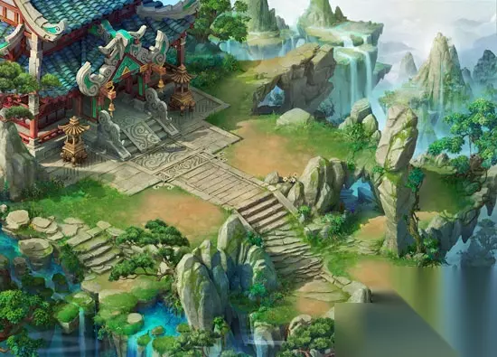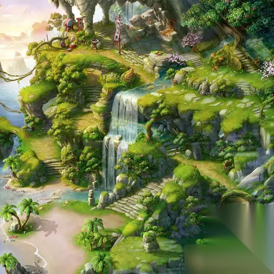 东海湾 花果山: 东胜神洲的一处世外桃源,齐天大圣的府邸所在,山上一年四季风景如画,气候温暖宜人,生长着各色花草果树,常有猿猴成群结队嬉戏于山泉瀑布之间。