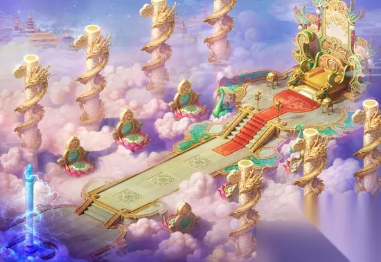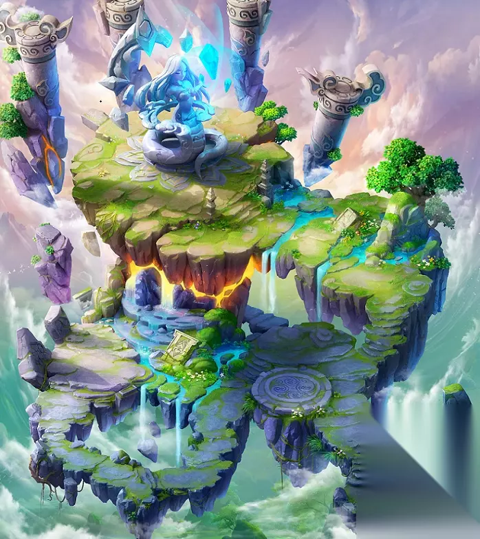 瑶池 女娲神迹: 女娲神迹正是颂扬女娲精神的所在,是当年女娲补天留下的神迹。它悬浮于极北端的天空之中。巨大的女娲神像矗立在天边,是女娲灵性的化身。神像周围由于受到女娲的护佑而四季常青,充满生命的气息。