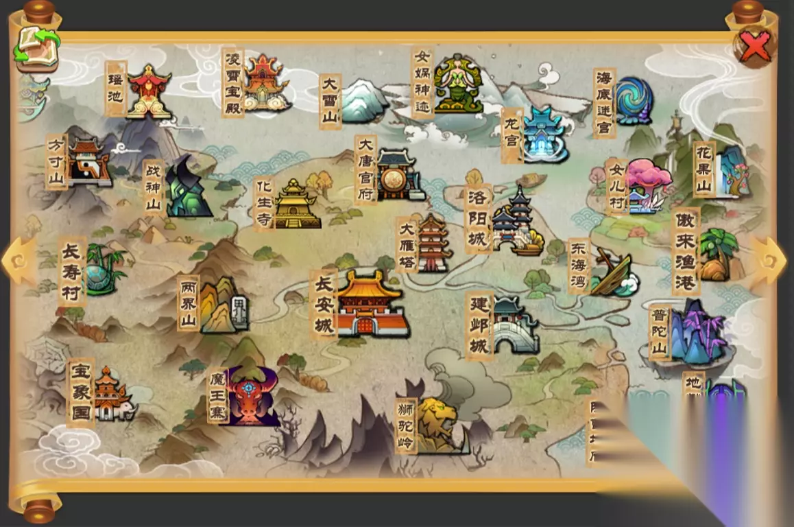 长安城 傲来渔港: 靠近东海,居民以捕鱼为生。傲来国里最广为人知的精怪当属那偷偷怪,没人知道他的来历,只知道他爱好收集五种宝贝。如果凑齐这些宝贝,可以跟他交换一张宝贵的高级藏宝图。