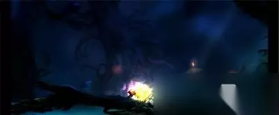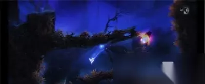 奥日与迷失森林关卡氤氲灯笼2 7、先跳上奥日刚才跌落位置右上方的精灵之井恢复一下生命值、能量值以及保存游戏。 然后使用羽毛滑翔伞去到左侧彼岸。