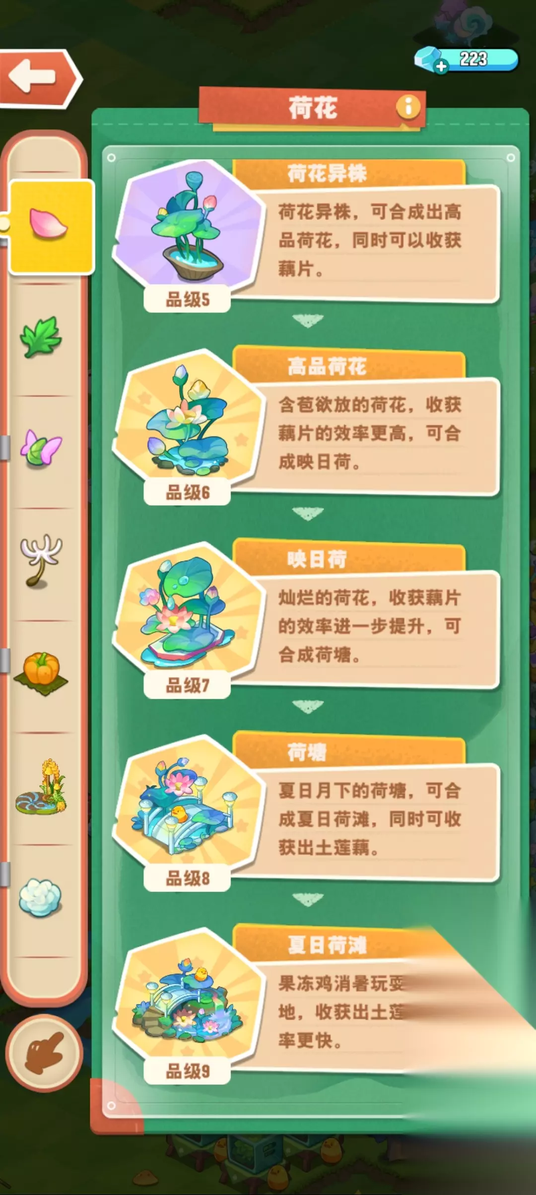 新荷花,5级开始产染墨(1级),2级的染墨就能开物品。 染墨物品:果酱、木材、抱枕(有10次保底) 点评:过程流畅,无动物参与,即合即开。 ———————————————— 旧荷花,5级开始产藕片(1级),2级的莲藕能通过动物采集出物品。 莲藕物品:果酱、木材、抱枕(无保底) 点评:过程繁杂,需要动物参与(紫藕消耗特定动物体力)。