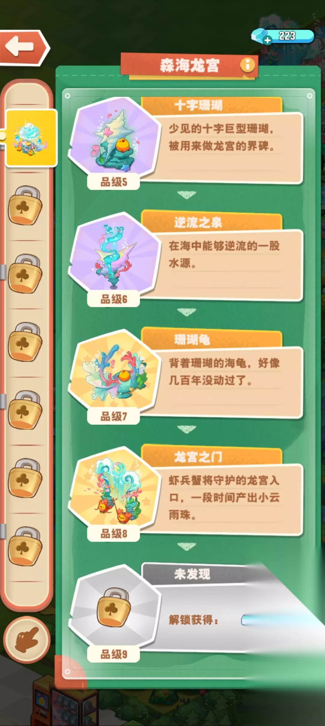 龙宫,8开始产龙珠(1级),4级能开物品。 龙珠物品:果酱、木材、建材、抱枕(抱枕没说保底,估计跟旧荷花一样)
