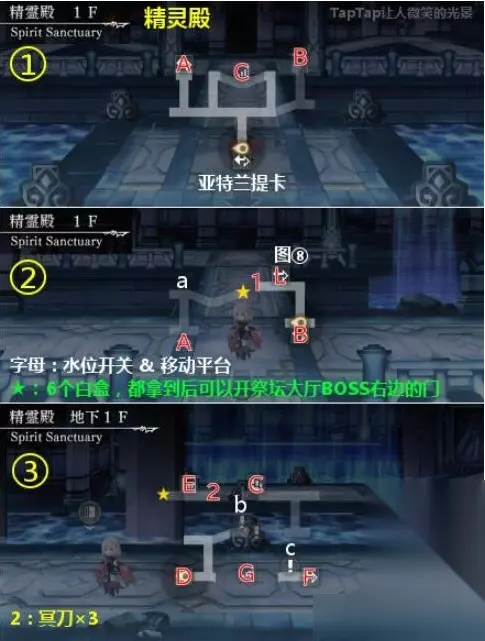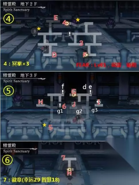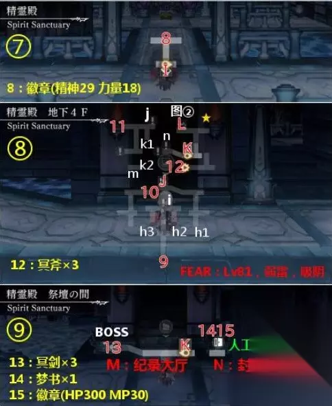 在另一个伊甸手游中,西方外典精灵殿流程是什么?很多小伙伴还不知道,接下来就让我们一起来了解下吧,感兴趣的小伙伴千万不要错过啦。 另一个伊甸西方外典精灵殿攻略 【精灵殿】 地图:9张 宝箱:1~15,其中2是冥刀×3,4是冥拳×3,7是徽章(幸运29 智慧18),8是徽章(精神29 力量18),12是冥斧×3,13是冥剑×3,14是梦书×1,15是徽章(HP300 MP30) ※流程:需要按开关控制水位,以改变道路,略复杂。 入口→A→a→白盒(图②)→A→C→b→D→白盒(图④左)→E→白盒(图③)&宝箱2→E→F→c→F→白盒(图④右)&宝箱4→F→G→d→白盒(图⑤)→H→宝箱7→H→f×2→g1→g2→I→宝箱8→I→g3→d→J→h1→i→h2→i→h3→j→k1→m(瀑布开关)→k2→k1→宝箱12→j→k1→n→白盒(图⑧)→L→L→K→BOSS→宝箱13(纪录大厅右边)→通关后重新回到图⑨,如果6个白盒都收集齐了,可以进入N,拿宝箱14和15,以及人工精灵探测器 FEAR:Lv81,弱雷,吸阴 隐藏要素:黄色★处为6个白盒,收集齐后可以开祭坛大厅BOSS右边的门进入封印大厅拿梦书,并获得人工精灵探测器(此为外典后日谈打人工精灵的必要条件),之后到如下地点会自动触发对话:伊斯亚,最终之岛,尼尔瓦,但是并不会发生什么。