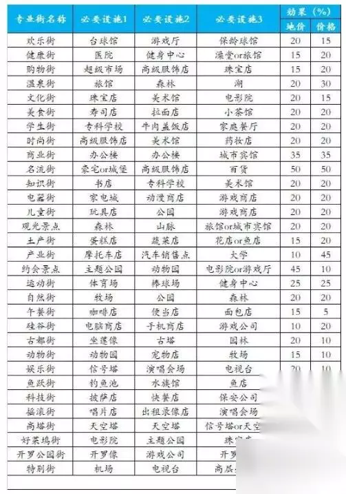 1、欢喜街: 台球馆+游戏厅+保龄球馆 提高地价20% 提高商品价格15% 其它版别称号↓ 欢喜街:柏青哥店 游戏中心 保龄球场 2、健康街: 医院+健身中心+浴室 或 旅馆 提高地价15% 提高商品价格20% 其它版别称号↓ 健康街:医院 健身房 浴场 或 旅馆 3、购物街: 超级市场+高档服饰店+珠宝店 提高地价15% 提高商品价格20% 其它版别称号↓ 购物街:超市 时装店 珠宝店 4、温泉街: 旅馆+树林+湖 提高地价20% 提高商品价格30% 其它版别称号↓ 温泉街:旅馆 湖 森林 或 岩石 5、文化街: 珠宝店+美术馆+电影院 提高地价20% 提高商品价格15% 其它版别称号↓ (这条找到的新旧版别称号相同) 6、美食街: 寿司店+拉面店+小茶馆 提高地价20% 提高商品价格20% 其它版别称号↓ 美食街:寿司店 拉面店 居酒馆 7、学生街: 专科校园+牛肉盖饭馆+家庭餐厅 提高地价20% 提高商品价格20% 其它版别称号↓ 学生街:专业校园 牛丼店 家庭餐厅 8、时髦街: 高档服饰店+美术馆+药妆店 提高地价20% 提高商品价格20% 其它版别称号↓ 纨绔子弟街:时装店 美术馆 药品店 9、商业街: 办公楼+办公楼+城市宾馆 提高地价35% 提高商品价格30% 其它版别称号↓ 商业街:办公楼 办公楼 奢华宾馆 10、名人街: 大豪宅+高档服饰店+百货 提高地价50% 提高商品价格50% 其它版别称号↓ 名人街:大豪宅(住所) 时装店 百货商铺 11、常识街: 书店+专科校园+美术馆 提高地价20% 提高商品价格20% 其它版别称号↓ 常识街:书店 专门校园 美术馆 12、电器街: 家电城+动漫商铺+游戏商铺 提高地价20% 提高商品价格20% 其它版别称号↓ 秋叶街:家电大卖场 动漫店 游戏店 13、儿童街: 玩具店+公园+游戏商铺 提高地价20% 提高商品价格20% 其它版别称号↓ 儿童街:玩具店 公园 游戏店 14、参观景点: 树林+山脉+ 城市宾馆 或 旅馆 提高地价20% 提高商品价格20% 其它版别称号↓ 参观地:森林 山坡 旅馆 或 奢华宾馆 15、特产街: 蛋糕店+蔬菜店+花店 或 鱼店 提高地价15% 提高商品价格20% 其它版别称号↓ 本地街:西点店 蔬菜店 花店或 鱼店 16、工业街: 摩托车店+轿车销售点+大学 提高地价10% 提高商品价格45% 其它版别称号↓ 工业街:机车营销店 轿车市场 大学 17、约会景点: 主题公园+动物园+电影院 或 游戏厅 提高地价45% 提高商品价格10% 其它版别称号↓ 幽会点:主题公园 动物园 电影院 或 游戏中心 18、运动街: 体育场+棒球场+健身中心 提高地价25% 提高商品价格25% 其它版别称号↓ 运动街:体育场 棒球场 健身房 19、天然街: 草场+公园+湖 或 树林 提高地价20% 提高商品价格20% 其它版别称号↓ 天然街:草场 公园 湖 或 森林 20、午饭街: 咖啡店+便利店+面包店 提高地价15% 提高商品价格5% 其它版别称号↓ 便餐街:咖啡店 便利店 面包店 21、硅谷街: 电脑商城+手机商铺+游戏公司 提高地价10% 提高商品价格20% 其它版别称号↓ 硅谷街:IT商城 手机卖场 游戏公司 22、古都街: 大佛像+三重塔+神社 提高地价20% 提高商品价格10% 其它版别称号↓ 古都之街:大佛寺 三重塔 神社 23、动物街: 动物园+宠物店+草场 提高地价15% 提高商品价格10% 其它版别称号↓ 动物街:动物园 宠物店 草场 24、文娱街: 信号塔+演唱会场+电视台 提高地价20% 提高商品价格10% 其它版别称号↓ 文娱街:信号塔 实况会场 电视局 25、鱼跃街: 钓鱼池+水族馆+鱼店 提高地价15% 提高商品价格10% 其它版别称号↓ 海味街:钓鱼池 水族馆 鱼屋 26、黑客街: 披萨店+快餐店+保安公司 提高地价5% 提高商品价格25% 其它版别称号↓ 黑客街:比萨店 快餐店 保安公司 27、摇滚街: 唱片店+租借录像店+演唱会场 提高地价5% 提高商品价格20% 其它版别称号↓ 摇滚街:唱片店 录像店 实况会场 28、高塔街: 天空塔+天空塔+信号塔 提高地价30% 提高商品价格30% 其它版别称号↓ 闹鬼塔街:摩天高塔 摩天高塔 信号塔 29、好莱坞街: 电影院+主题公园+高档服饰店 或 珠宝店 提高地价20% 提高商品价格25% 其它版别称号↓ 好莱坞街:电影院 主题公园 时装店 或 珠宝店 30、航天飞机街: 火箭发射台+天空塔+机场 提高地价30% 提高商品价格30% 其它版别称号↓ 络绎街:太空游览局 摩天高塔 机场