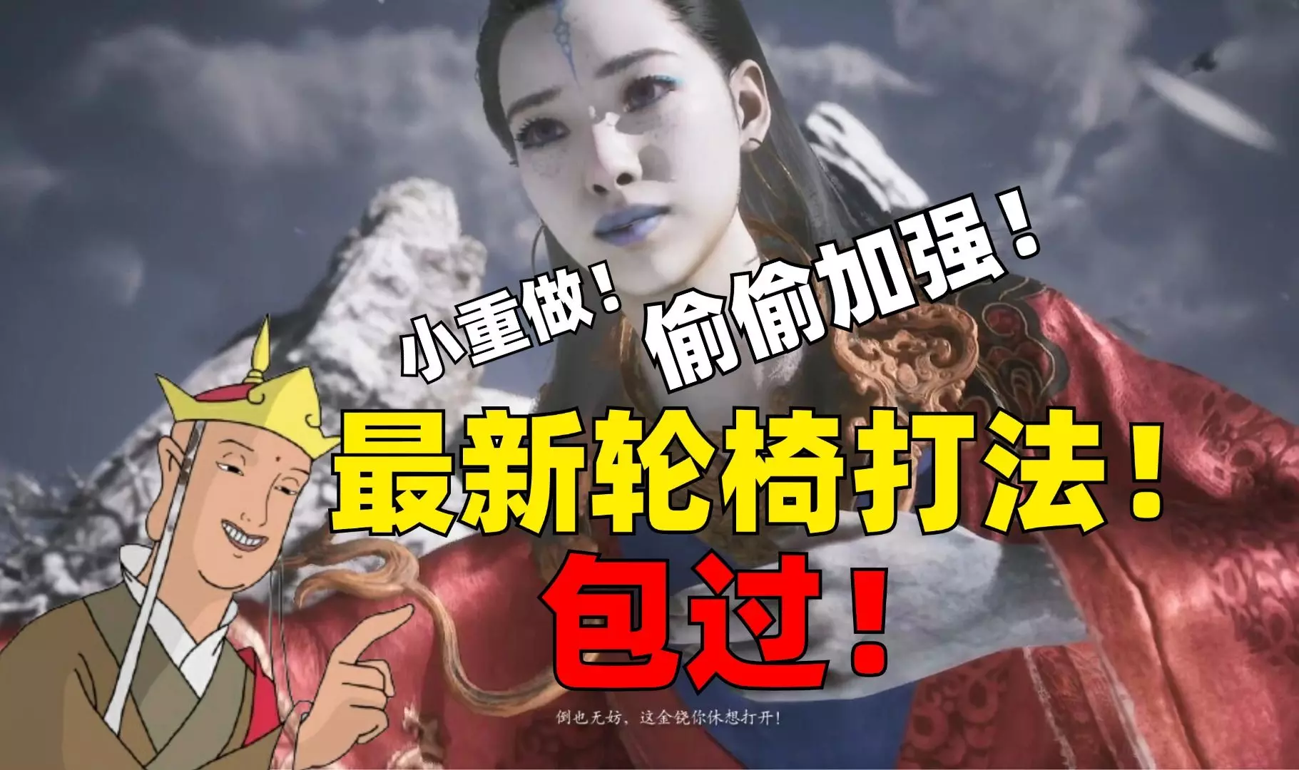 这是《黑神话悟空》的打法攻略,分享了“六根一性”连战的轮椅打法思路,搭配定风珠等装备,演示了击败黑熊精、黄风大圣等boss的过程,操作门槛低,有手就能上手。