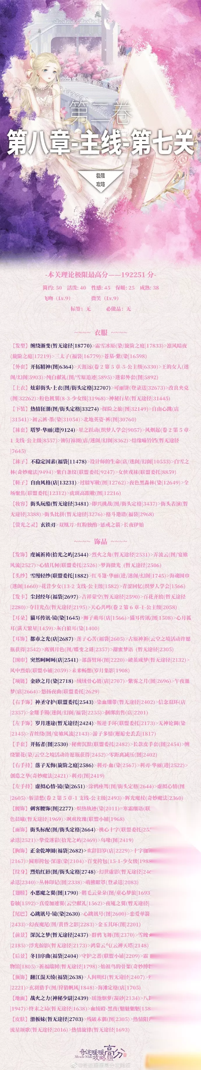 本文为大家带来奇迹暖暖卷二8-7的通关攻略,跟着大喵可保底过关,还附上了极限高分的搭配详情,包含发型、衣服、饰品等多部位的搭配推荐,能帮助玩家拿到192251的理论极限最高分,助力玩家完美通关。