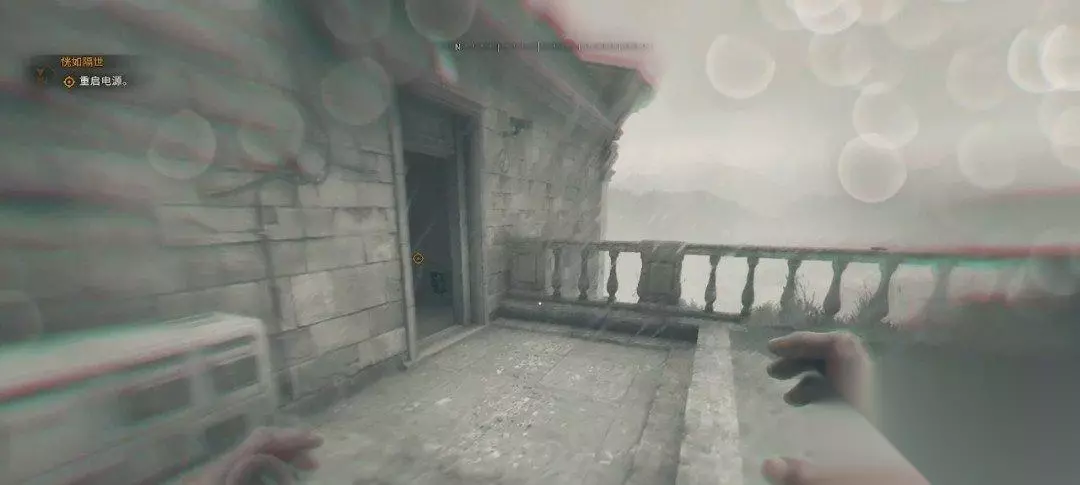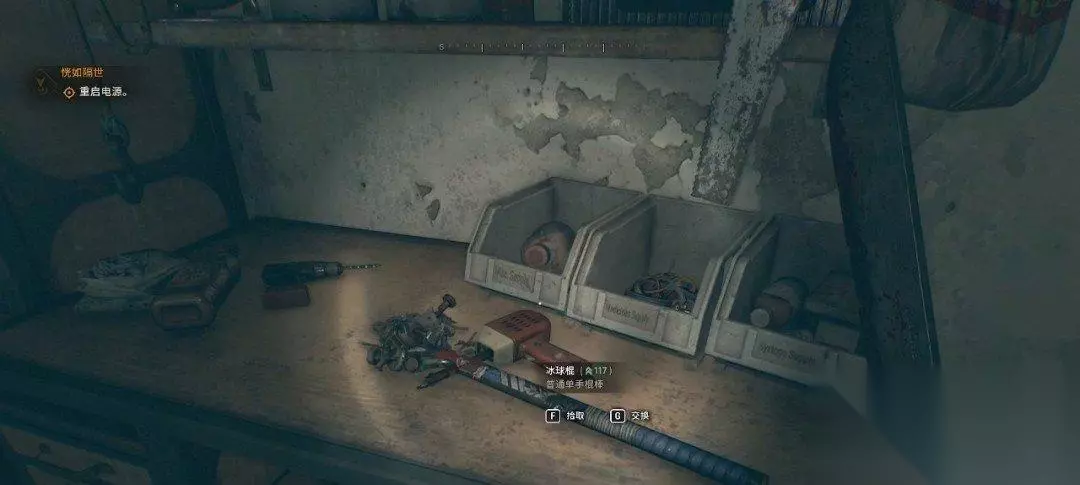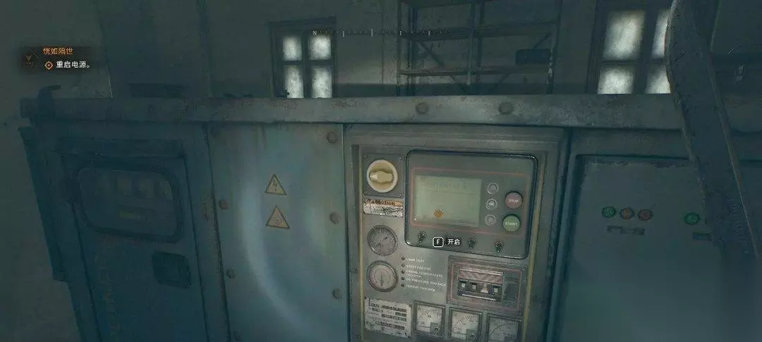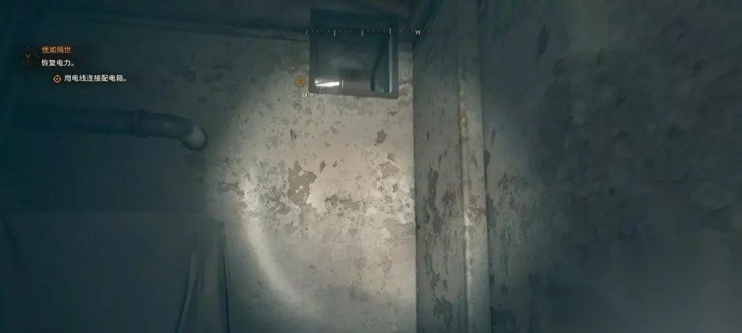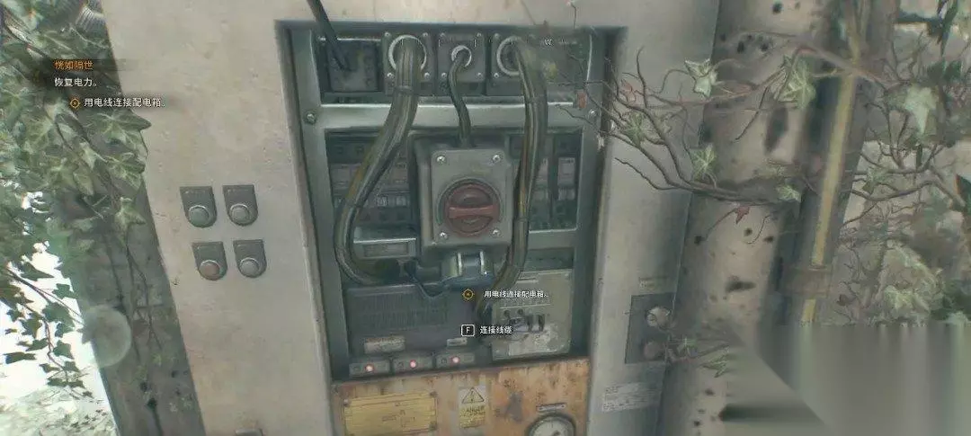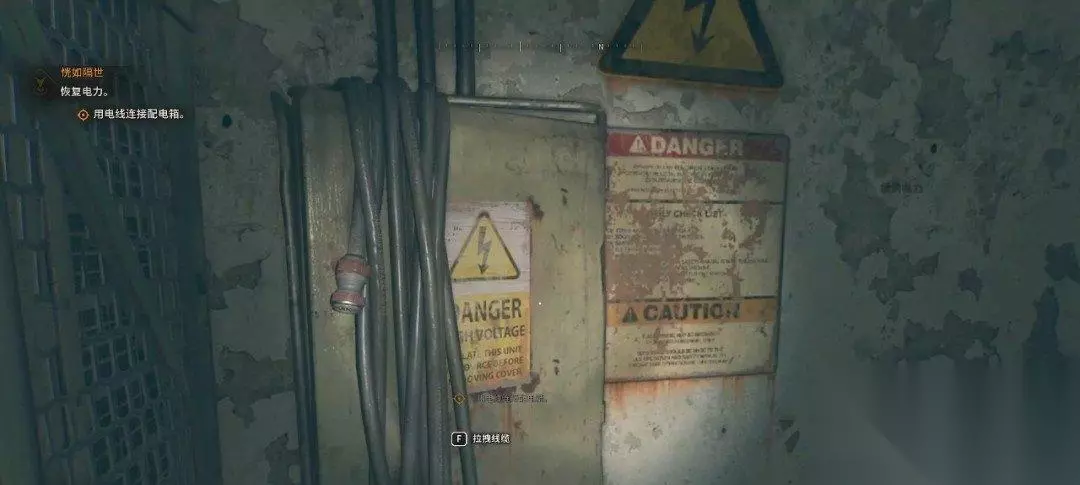 然而电源线被怪物扯烂了,我们要重新接线。和墙壁上的电箱互动,我们可以把线缆拽在身上。