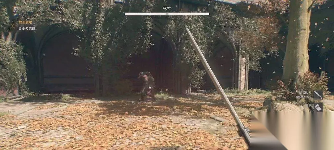 谈话结束后她会给我们一把武器,而附近刚好有奇美拉杀了过来,我们下楼和它对战。在战斗的时候可以按3号键切换使用的武器,左键就可以使用。